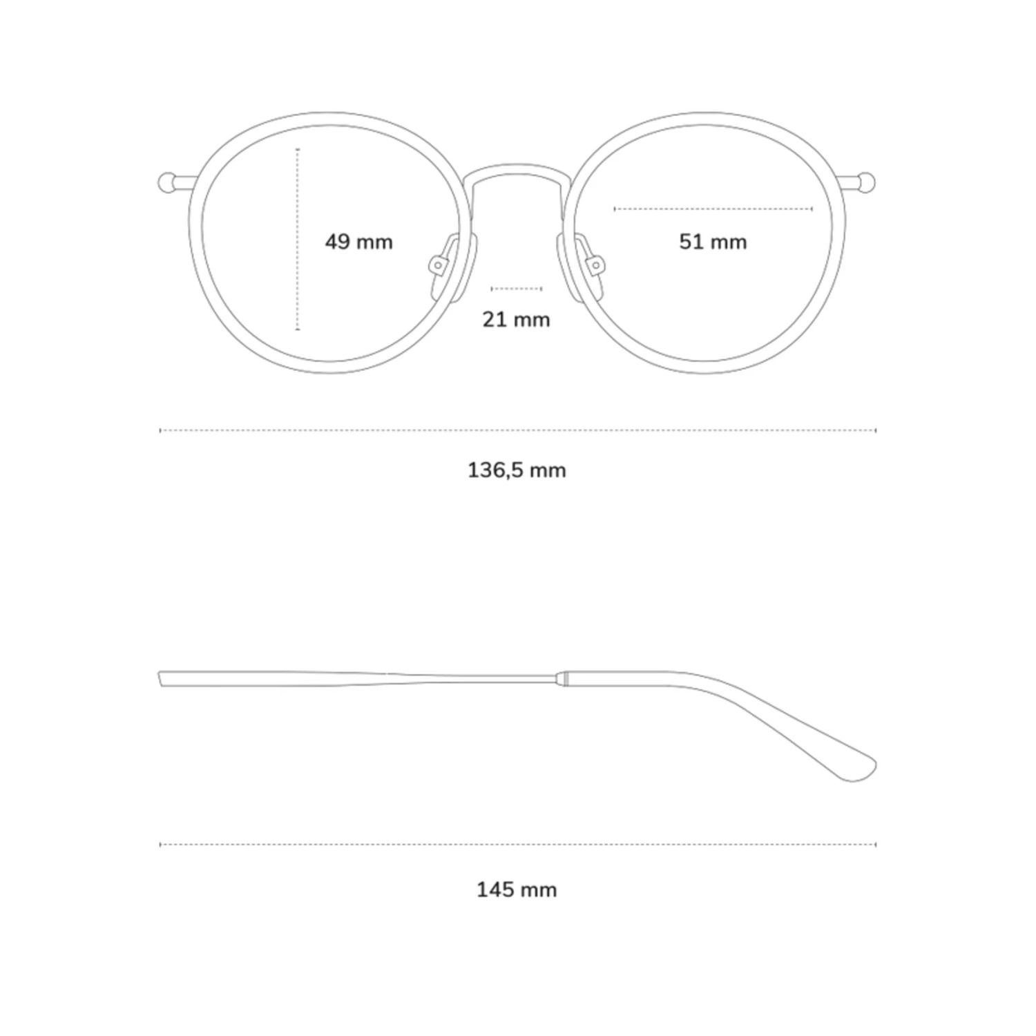 - Rahmenbreite: 136,5mm, Bügellänge: 145mm, Glasbreite: 51mm, Glashöhe: 49mm