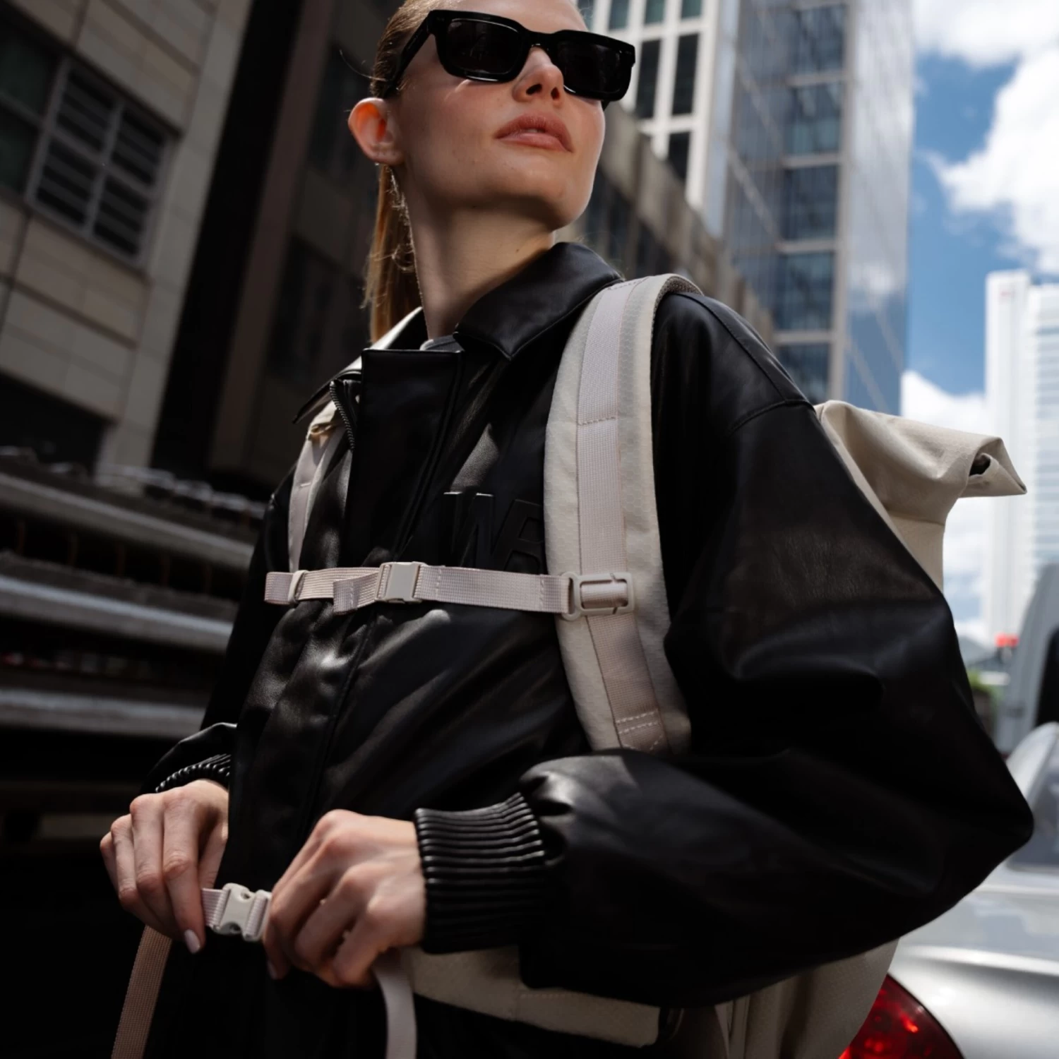 - extra wasserabweisender Mix aus Ripstop, recyceltem PET und veganem Tech-Material