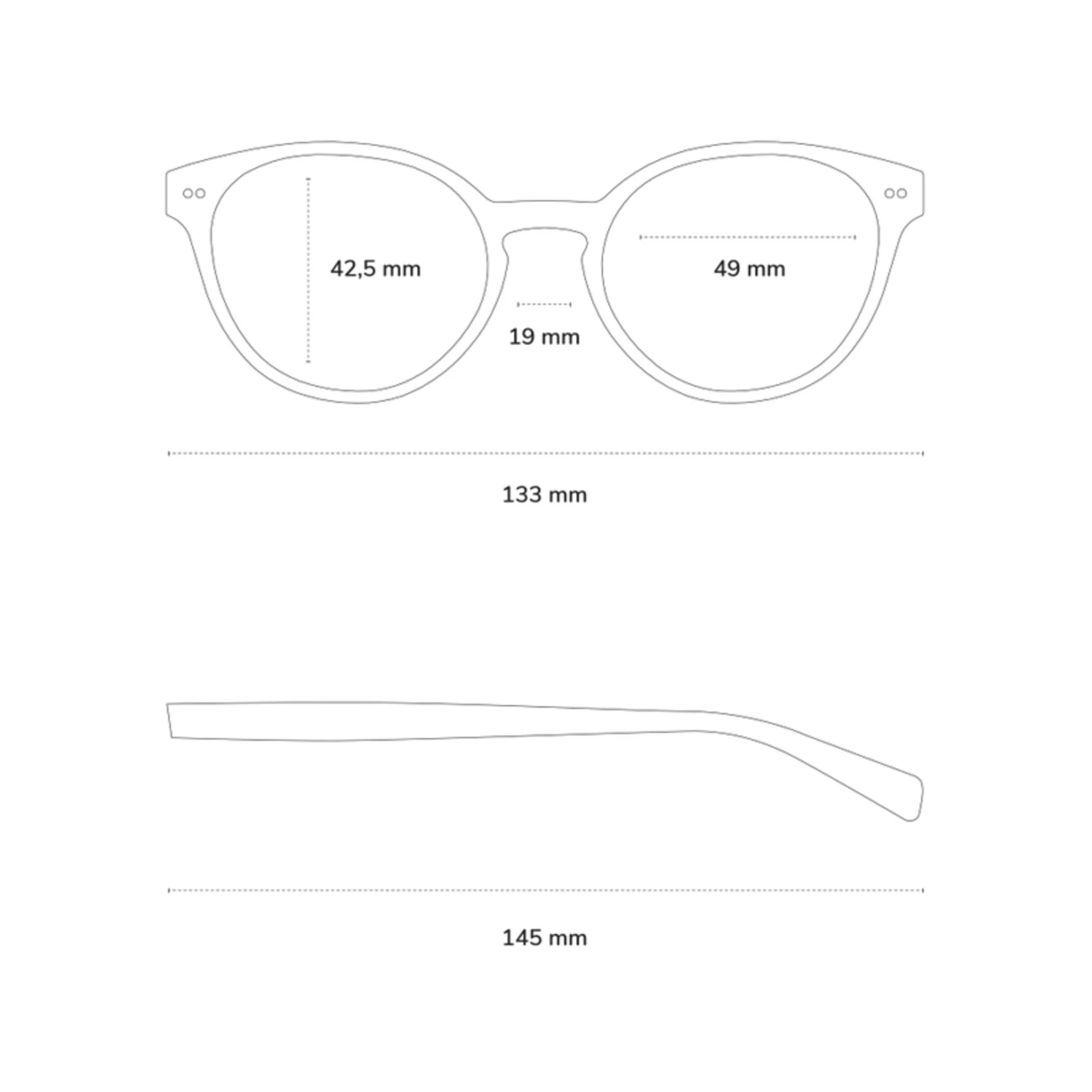 - Rahmenbreite: 133mm, Bügellänge: 145mm, Glasbreite: 49mm, Glashöhe: 42,5mm
