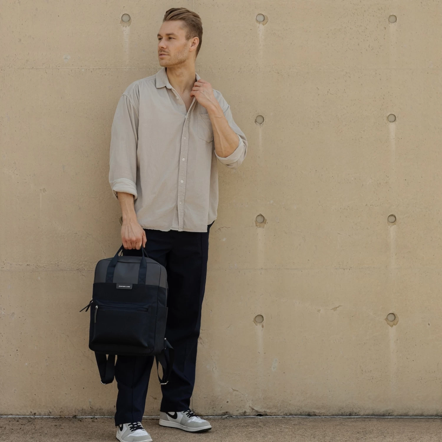 - glattes, veganes Tech-Material im oberen Teil und recyceltes PET mit leichter Struktur im unteren Teil ergeben einen hochwertigen Materialmix