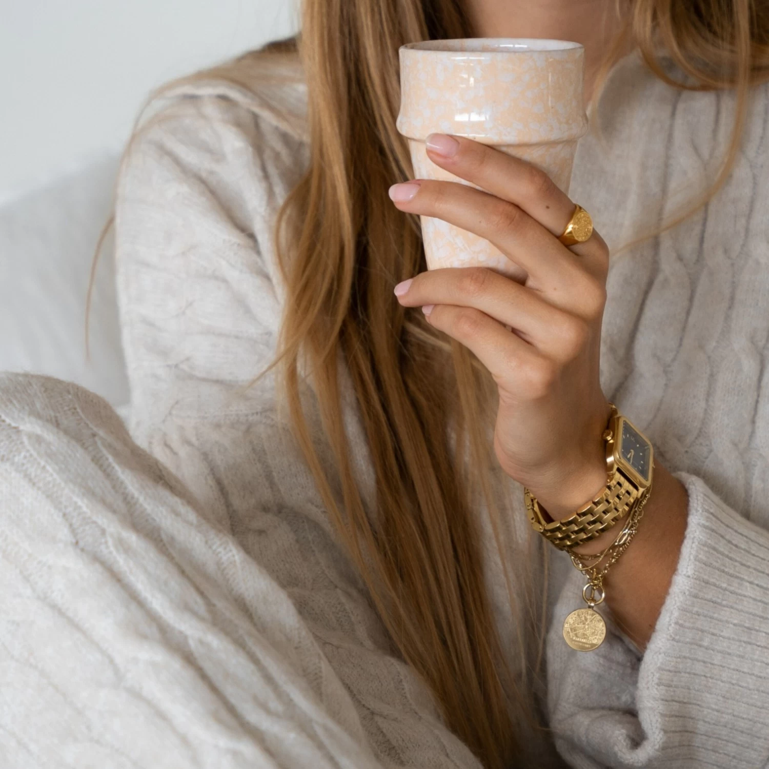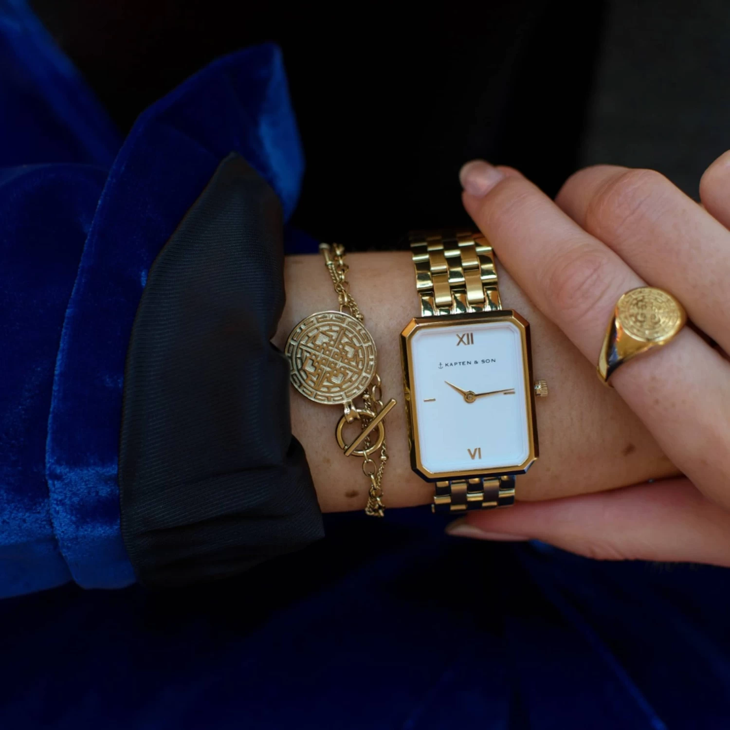 Mit unserem goldenen Bracelet Charming Marrakech Gold setzt du dein Handgelenk perfekt in Szene! Das extravagante Armband aus hochwertigem 316 L Edelstahl kombiniert zwei unterschiedliche Glieder-Strukturen – eine etwas gröbere Ankerkette vereint mit einer feinen Panzerkette mit Kugelbesatz. Besonderes Highlight ist der auffällige MĂĽnzanhänger mit Ornament-Prägung, auf dessen RĂĽckseite das Stadtbild der bezaubernden Stadt Marrakech eingraviert ist. Sowohl die Kettchen als auch der Anhänger sind mit 14k vergoldet und ĂĽberzeugen somit nicht nur durch ihre Formgebung, sondern zudem durch Qualität. Der Goldton dieses SchmuckstĂĽckes ist besonders weich, ohne kĂĽnstlich wirkenden Gelbstich-Effekt. Nachdem du die fĂĽr dich passende Größe des Armbandes eingestellt hast, kannst du dieses mit Hilfe des stylischen T-Verschlusses ganz einfach an deinem Handgelenk befestigen. Get the Look: mit dem Armband Bracelet Charming Marrakech Gold setzt du ein Style-Statement!
