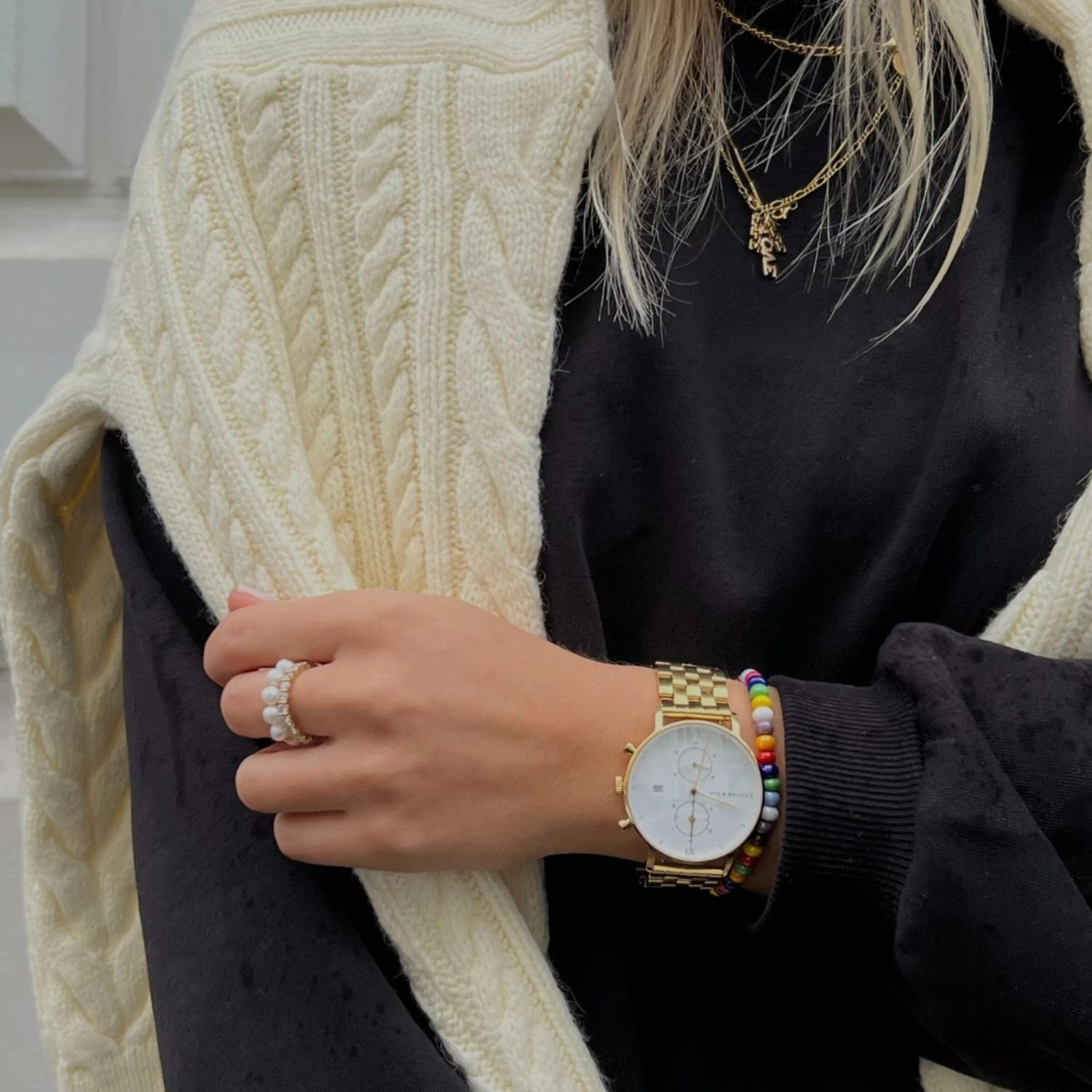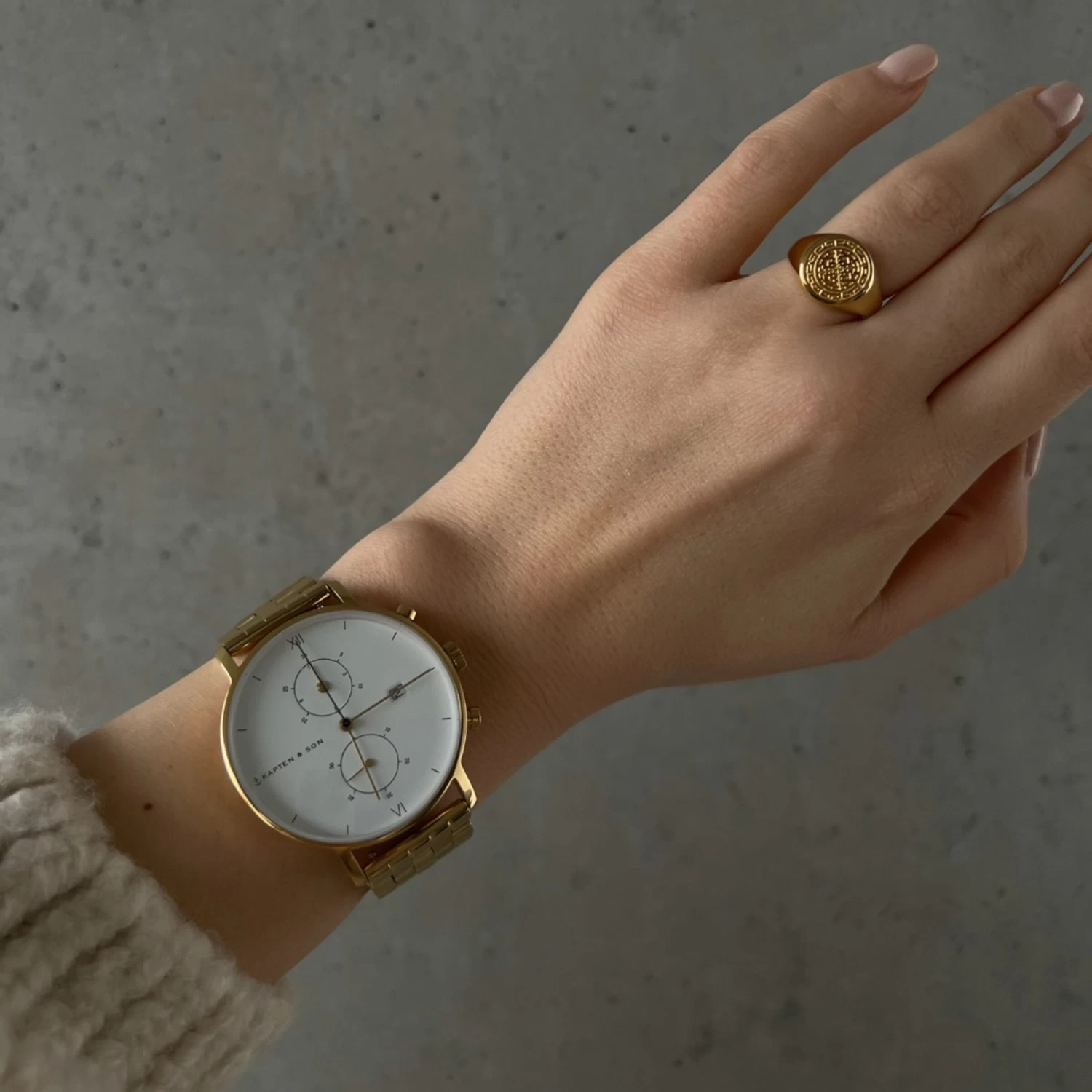 Diese schöne goldene Uhr ist ein absolutes Must-have. Der Chrono Gold Steel besitzt ein cleanes, elfenbeinweißes Zifferblatt, das von einem robusten Edelstahlgehäuse aus edlem Gelbgold umgeben wird. Für zusätzlichen Schutz sorgt das hochwertige Uhrenglas aus kratzfestem Saphirglas. Darunter befinden sich zwei zusätzliche Zifferblätter für die Stoppfunktion und die Sekunden sowie eine Datumsanzeige. Ein zuverlässiges Quarzuhrwerk des Schweizer Herstellers Ronda bildet das Herzstück der Uhr. Der Chrono Gold Steel ist nicht nur ein wunderschöner Blickfang sondern auch ein absolutes Premiumprodukt.