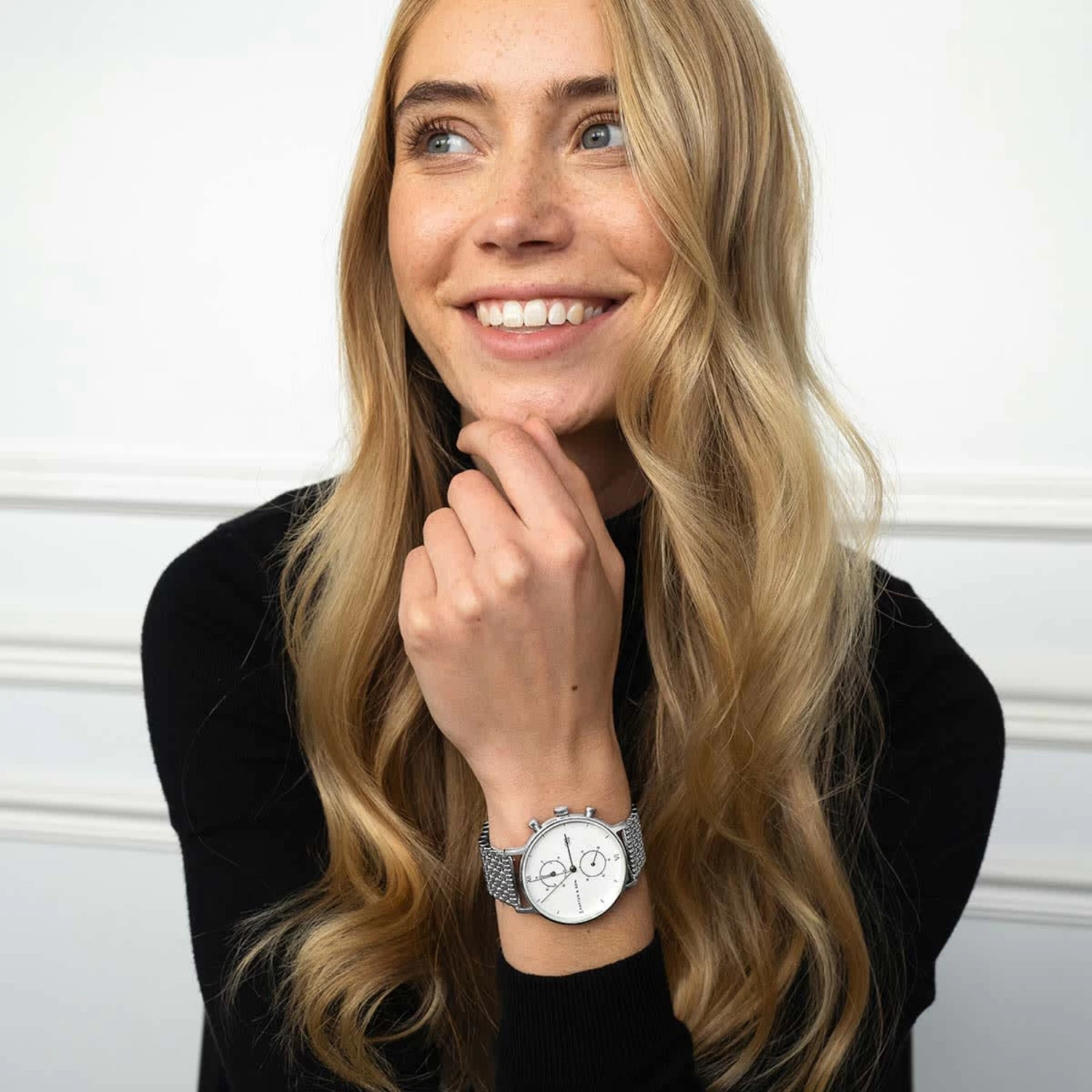 Unsere Chrono Small Silver Woven Steel Chronographen-Uhr trumpft durch ihren eleganten Look, kombiniert mit einer erstklassigen Materialwahl! Sowohl das edle Gehäuse als auch das feingliedrige Armband in markant filigraner Flecht-Optik sind aus hochwertigem 316L Edelstahl gefertigt. Das 37mm groĂźe, klassisch weiĂźe Ziffernblatt wird durch eine zusätzliche Stoppfunktion sowie integrierte Datumsanzeige geziert und von einer Kuppe aus besonders kratzfestem Saphirglas umhĂĽllt. Das HerzstĂĽck dieser Uhr bildet das Uhrwerk des Schweizer Herstellers Ronda, welches besondere Langlebigkeit verspricht – so ist der Chrono Small Silver Woven Steel nicht nur optisch ein ganz besonderes Highlight! Du suchst nach einem SchmuckstĂĽck der Extraklasse? Dann ist diese Armbanduhr das perfekte Accessoire fĂĽr dich!