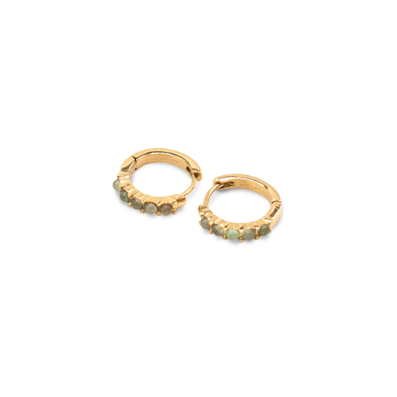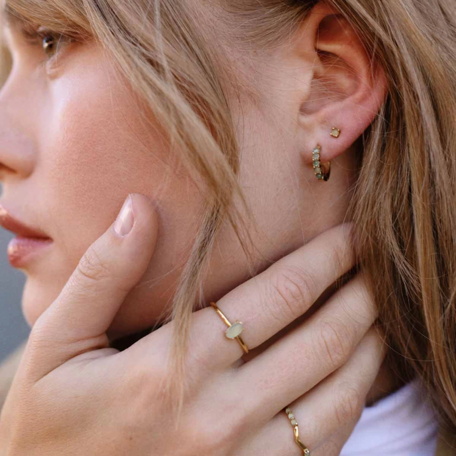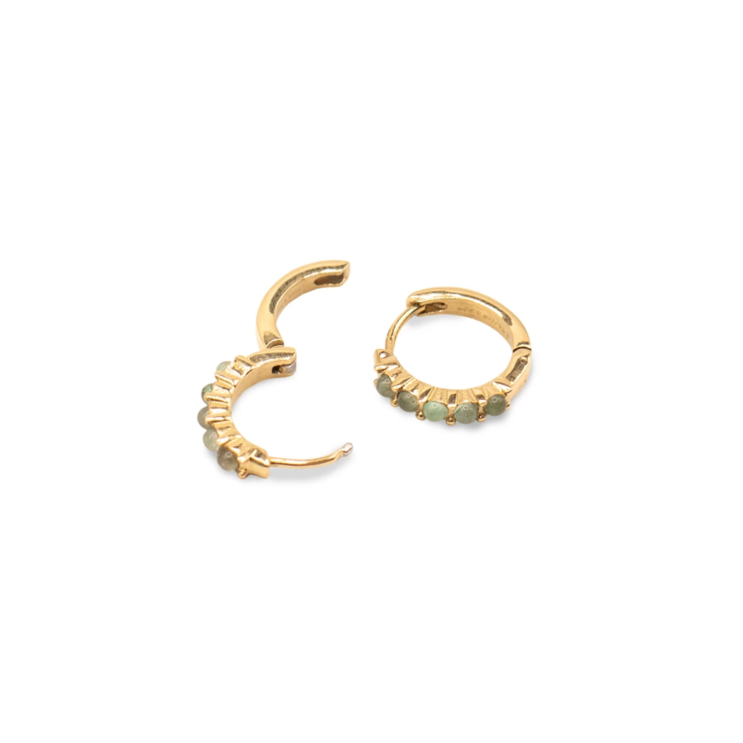 Ob als Einzelstück oder Upgrade für dein Ear Candy Game: Die Earring Hoops Harmony Stone Gold sind ein Must-have in deiner Schmucksammlung und natürlich an deinen Ohren! Die filigranen Mini-Creolen aus hochwertigem, 14k vergoldetem Edelstahl sind mit jeweils fünf Aventurinen besetzt. Dieser Edelstein ist dafür bekannt, Kraft und Selbstvertrauen zu spenden und eine ausgleichende Wirkung zu haben. In jedem Fall sieht die Kombination aus Gold und Grüntönen umwerfend aus. Du kannst außerdem sicher sein, dass dein Paar Earring Hoops ein absolutes Unikat ist, da der Aventurin ein Naturprodukt ist und die Farbe daher immer leicht variiert.
