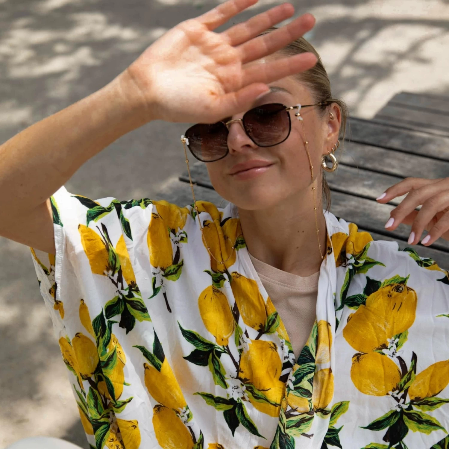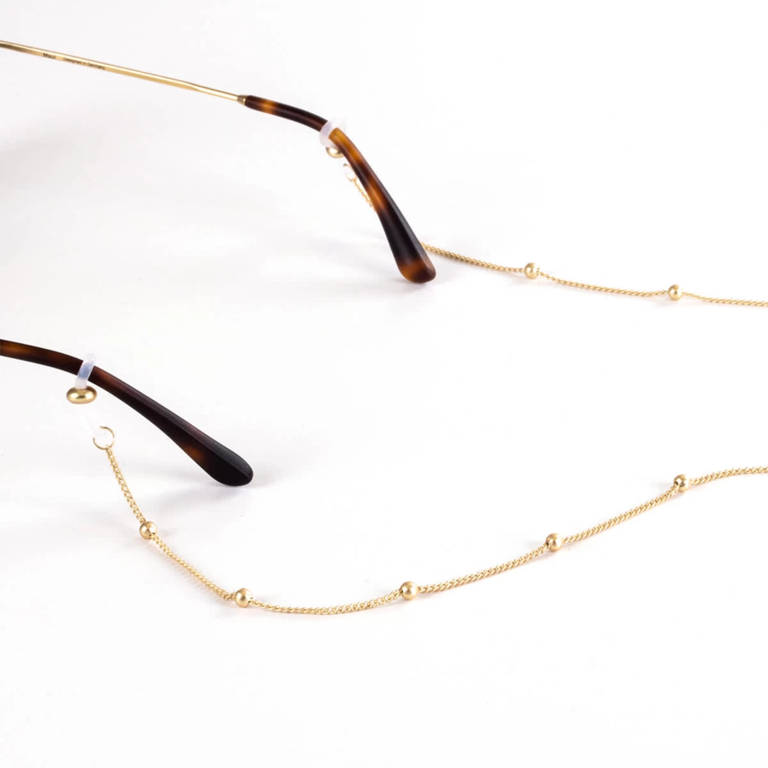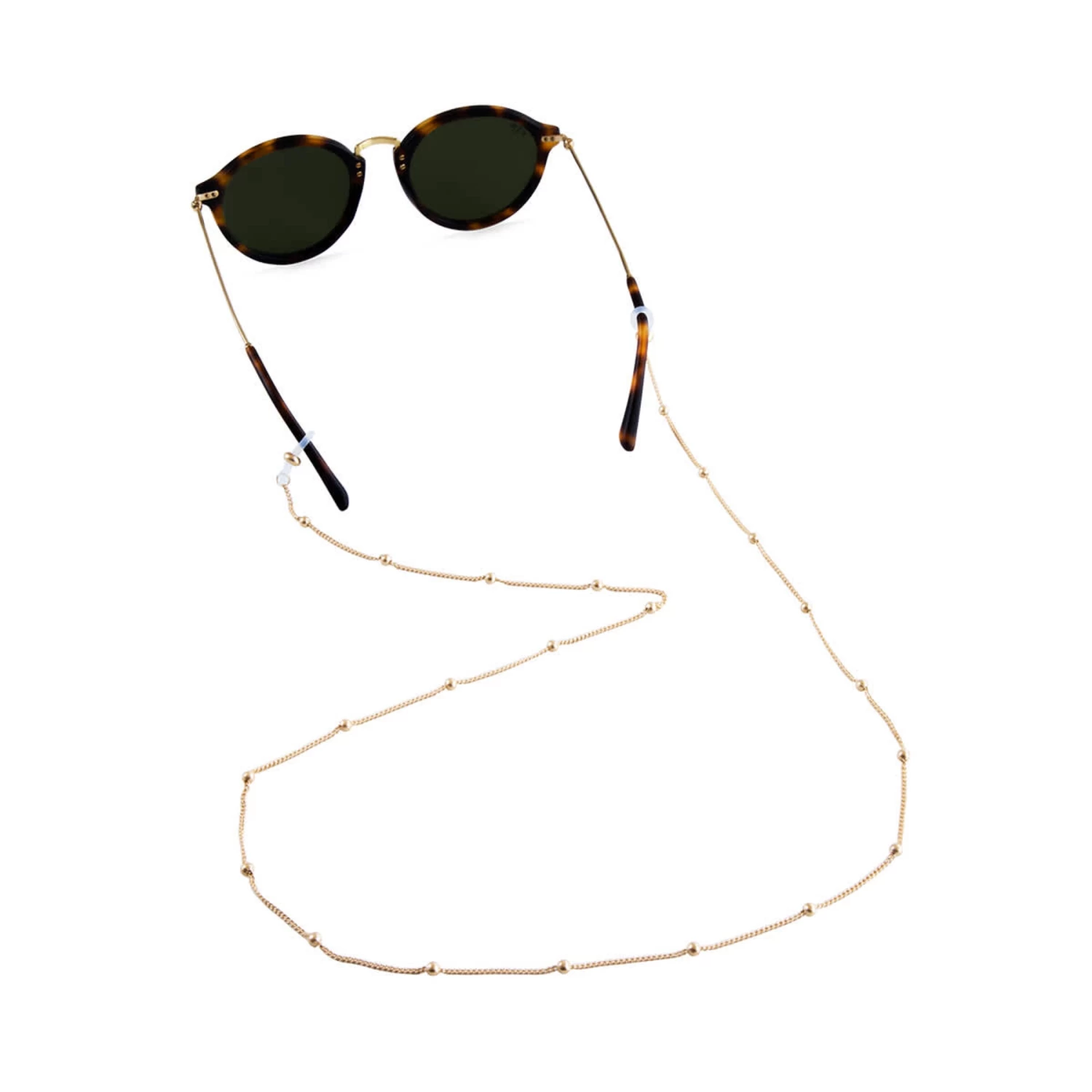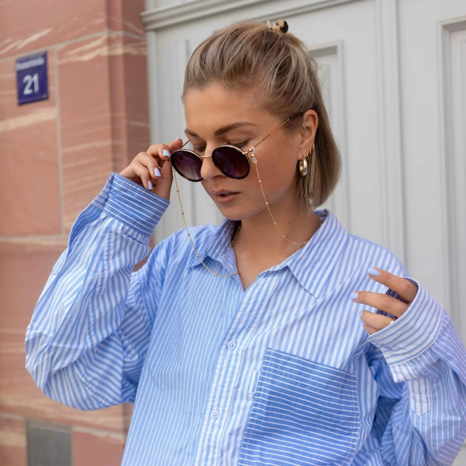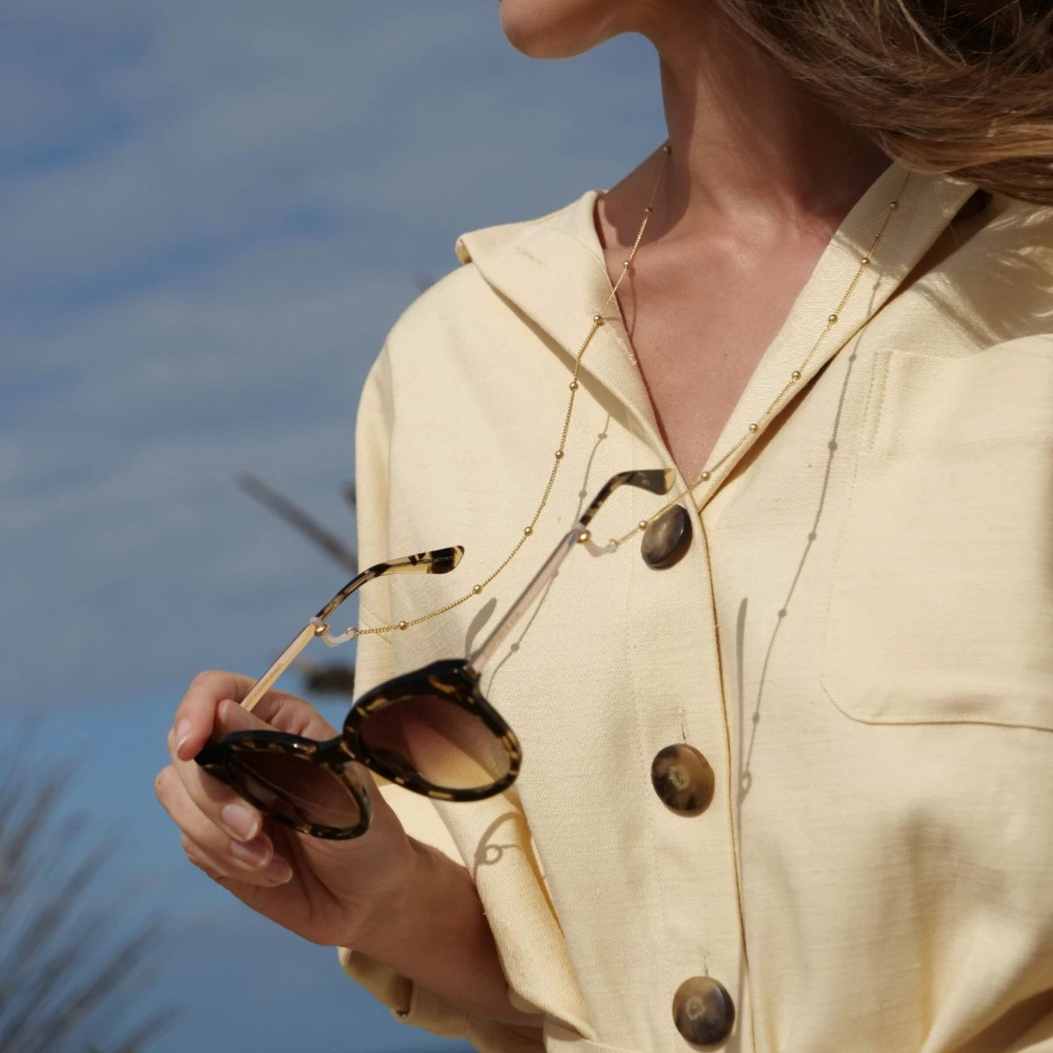 Ganz egal ob fĂĽr sonnige Strandtage, unvergessliche Festivals oder den Alltag in der sommerlichen City – unsere Eyewear Chain Varna ist einfach das perfekte Accessoire fĂĽr warme Tage: Denn mit ihren goldenen Kugeldetails verleiht die Brillenkette jedem Look das gewisse Etwas. Gleichzeitig musst du dir nie wieder Sorgen machen, dass du deine Sonnenbrille verlierst!