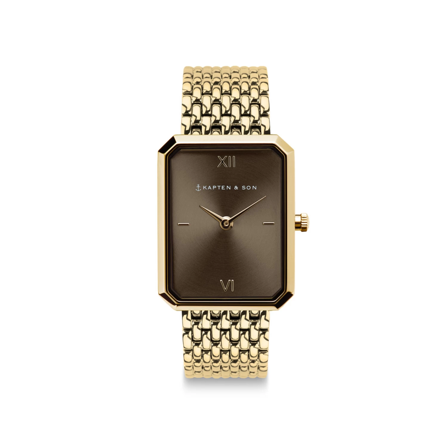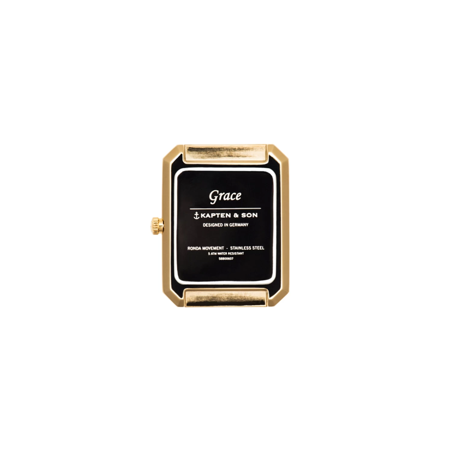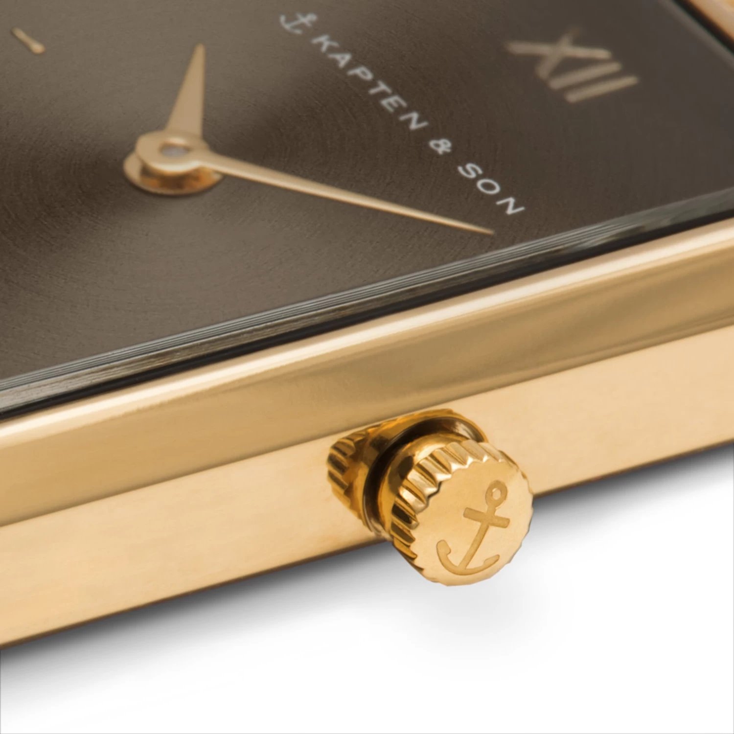Extravagant und zeitlos schön: die Grace Gold Brown Woven Steel. Aufwendige Formgebung trifft auf eine warme Kombination aus Gold- und Brauntönen. Das feingliedrige Armband in geflochtener Optik aus hochwertigem 316L Edelstahl lässt sich dank des Schmetterlingsverschlusses ganz einfach öffnen und schließen. Bei Bedarf kann es vom Juwelier deines Vertrauens angepasst werden. Herzstück des markant eckigen Gehäuses ist das Quarzuhrwerk des Schweizer Herstellers Ronda, das für die Langlebigkeit der Uhr sorgt. Das filigrane Zifferblatt in tiefem Braun wird durch hochwertiges Mineralglas geschützt. Die Grace Gold Brown Woven Steel ist nicht nur ein unvergleichlicher Blickfang, das Premiummodell überzeugt auch durch Qualität und lässt dich überall glänzen.