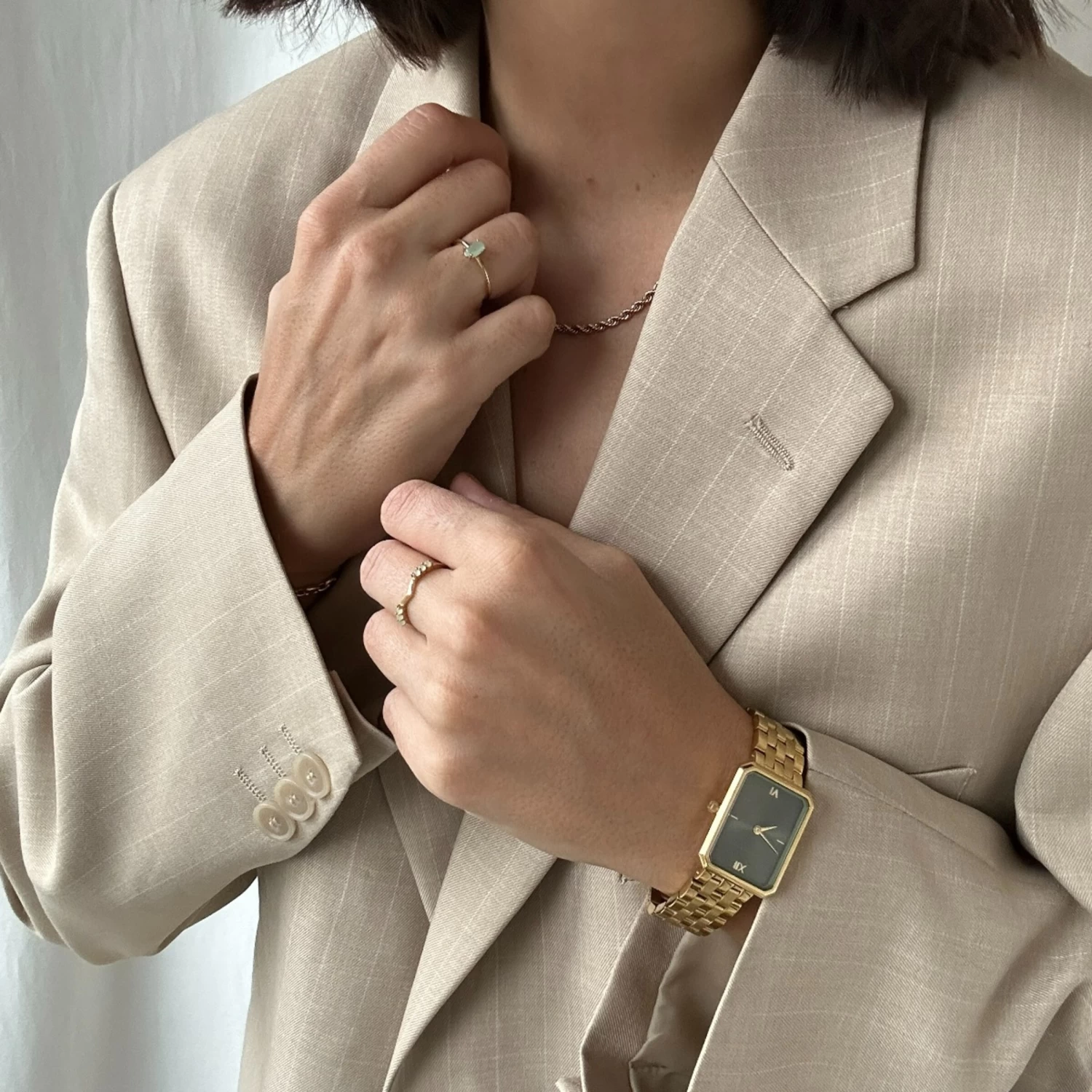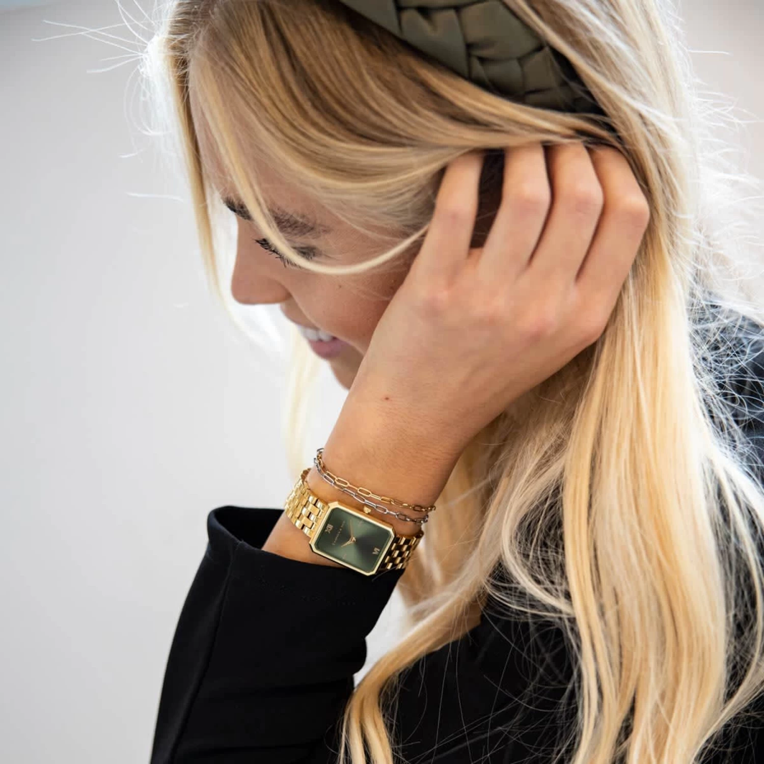 Unser Uhrenmodell Grace überzeugt vor allem durch ihr auffälliges Design, denn dank der markant eckigen Formgebung und kontrastreichen Farbakzente erhält diese Uhr einen ganz besonderen Look. Passend zur Winter-Saison haben wir jetzt eine streng limitierte Special-Edition dieser Uhr gelauncht, bei der das Zifferblatt in extravagantem Smaragdgrün erstrahlt: wir präsentieren die Grace Gold Green Steel Uhr. Das edle Grün matched hierbei perfekt mit dem warmen Goldton dieser besonderen Damenuhr aus hochwertigem 316 L Edelstahl und macht sie zu einem absoluten Eye-Catcher. Dank des ebenfalls in Gold gehaltenen nickelfreien Gliederarmbandes passt sich die Grace perfekt dem Handgelenk an, ist größenverstellbar und verspricht durch ihren leicht zu öffnenden Butterfly-Verschluss eine einfache Handhabung. Ihr hochwertiges Uhrwerk stammt vom Schweizer Hersteller Ronda und verspricht eine besondere Langlebigkeit. Somit ist die Grace Gold Green Steel nicht nur optisch ein absolutes Highlight – sie überzeugt auf ganzer Linie und ist ein absolutes Must-Have!