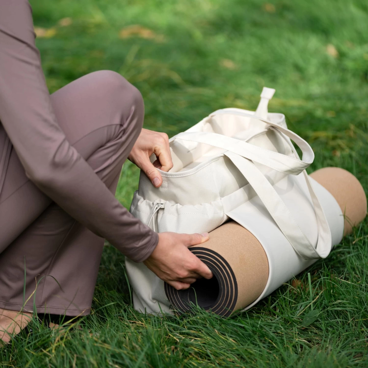 - Halterung auf der Vorderseite (z.B. für eine Yogamatte) und separates Schuhfach