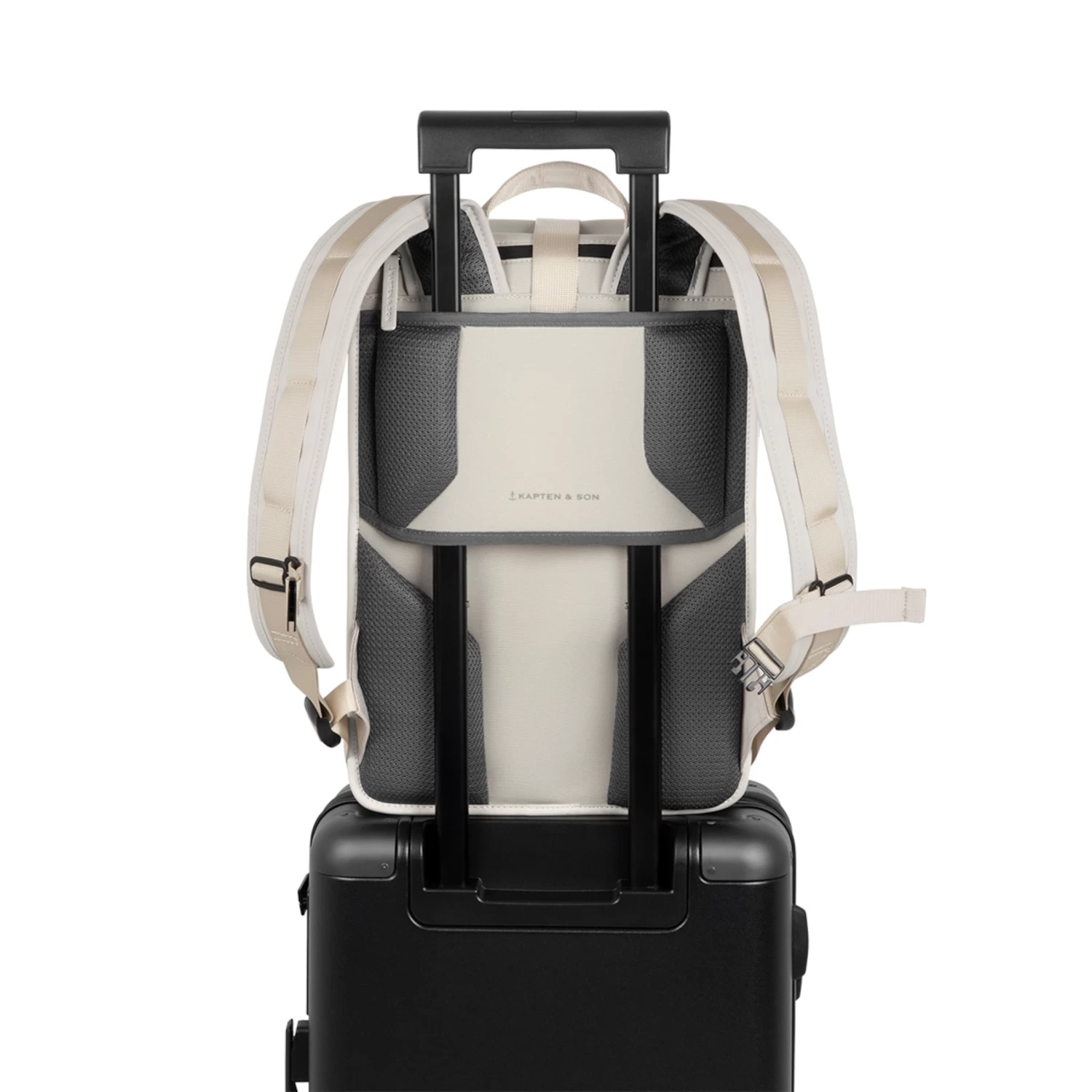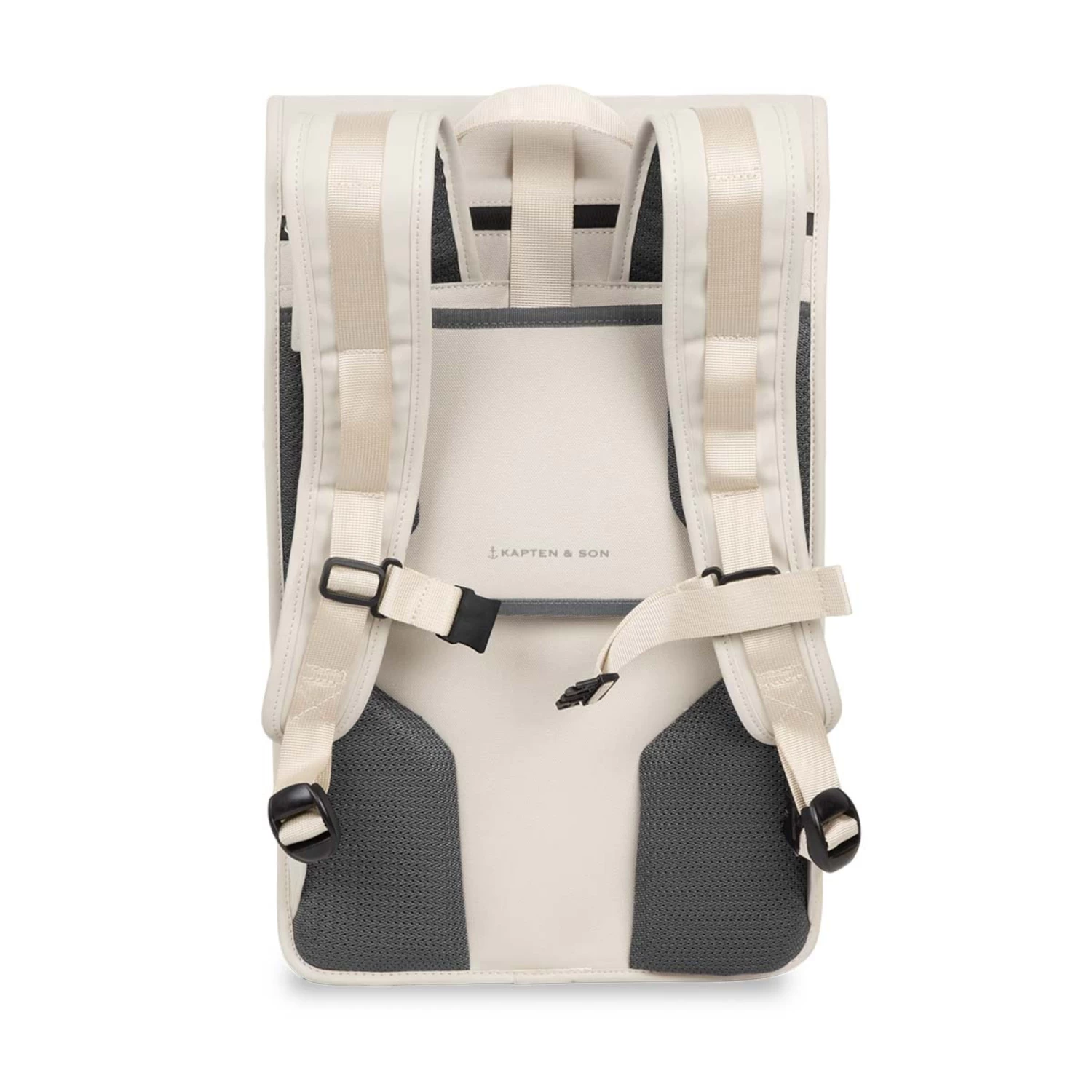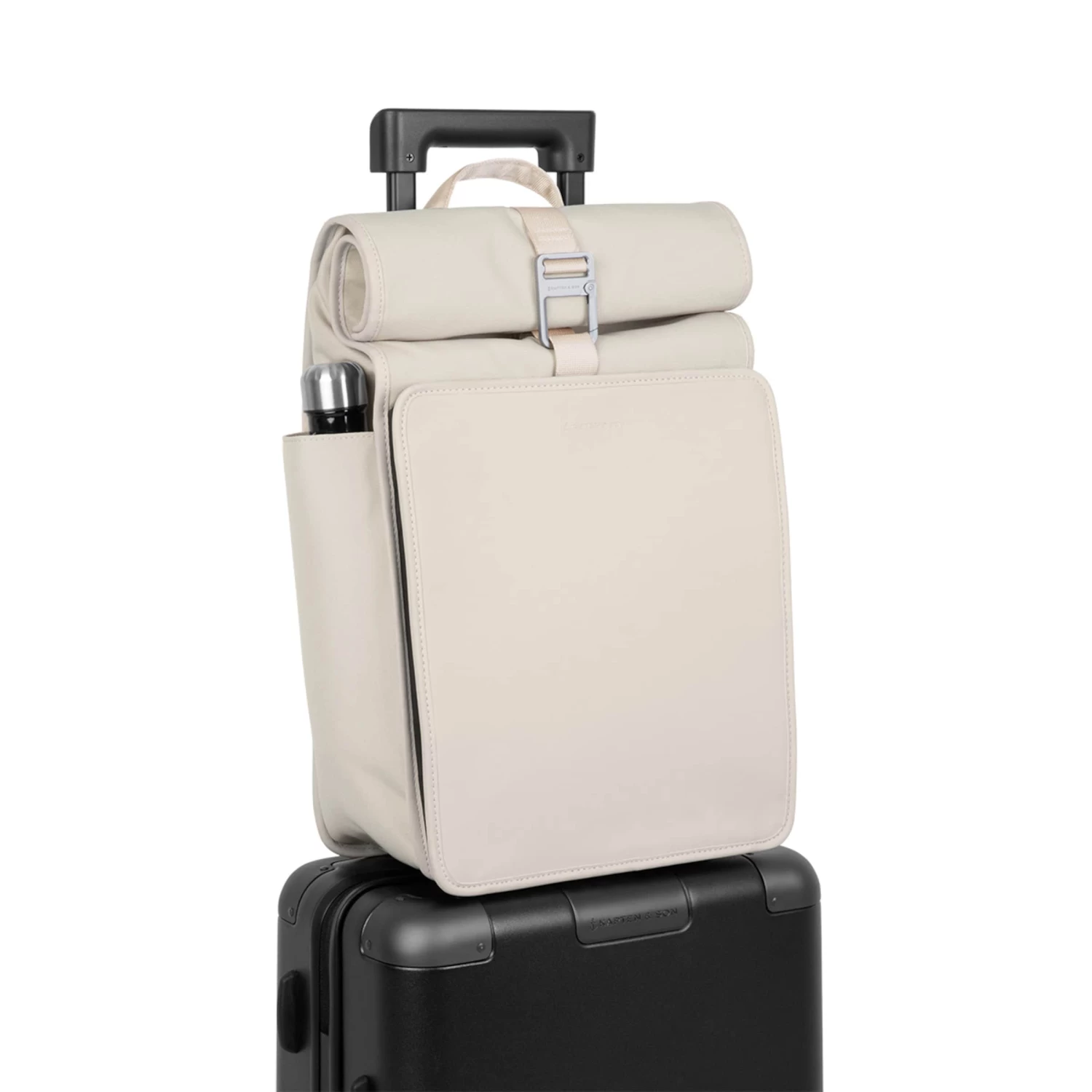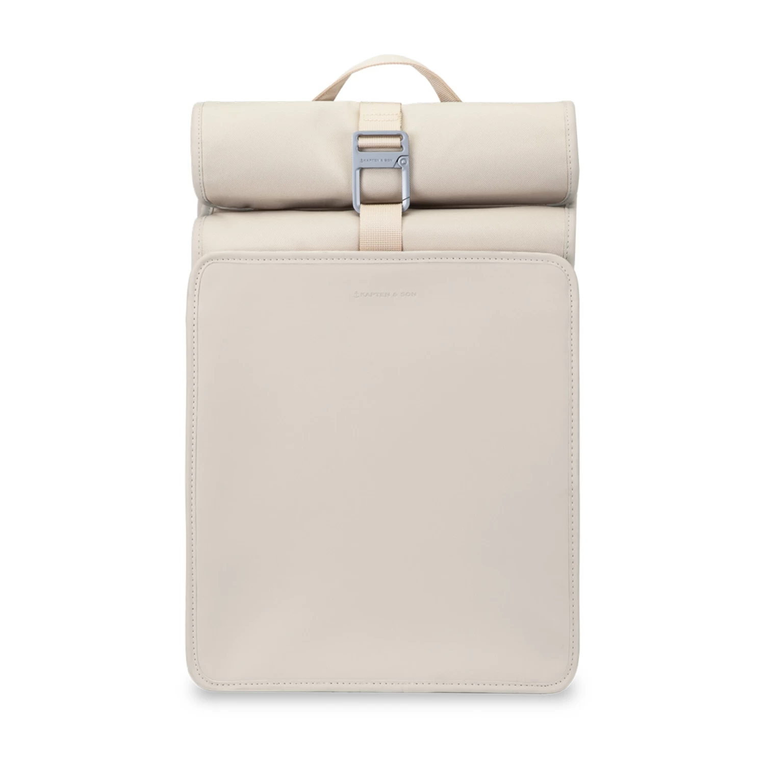 Get the Look – unser Rucksack Lund Pro Sandstone! Du stehst auf ein cleanes, gradliniges Design und liebst besondere Features? Dann ist dieser Rucksack dein perfekter Begleiter, denn er punktet sowohl durch sein minimalistisches Design als auch durch komfortable Funktionalitäten. Optisch überzeugt der Torso des Backpacks durch seine kastenförmige Formgebung, kombiniert mit einem runden, einrollbaren Flap. Perfektioniert wird der Look durch die Materialwahl – feines veganes Kunstleder und recyceltes PET in hellem Creme-Beige. Und auch die inneren Werte des Lund Pros können sich sehen lassen: in den insgesamt drei separaten Innenfächer kannst du die notwendigen Dinge des Alltags ideal verstauen und in dem extra gepolsterten Laptopfach findet sogar dein Notebook seinen Platz – eine weitere Seitentasche ermöglicht es dir außerdem, deine Trinkflasche sicher unterzubringen. Praktischerweise ist der Stauraum dieses Kurierrucksacks erweiterbar, denn die Flap kann ebenfalls befüllt werden. Ein weiteres Highlight ist das geräumige Außenfach an der Vorderseite, das einen praktischen Zugang zum Innenfach ermöglicht, sodass du den Lund Pro ganz easy auch hierüber packen und Dinge gezielt entnehmen kannst. So gehört lästiges Suchen ab sofort der Vergangenheit an! Ein gesondertes Fach auf der Rückseite ist mit einem Reißverschluss gesichert und bietet eine weitere Verstaumöglichkeit. Auch für den Tragekomfort ist gesorgt: sowohl das Rückenteil als auch die Träger sind speziell gepolstert, wodurch der Rucksack angenehm zu tragen ist. So ist unser Lund Pro Sandstone ein absolutes Produkt der Extraklasse – er überzeugt durch stilistische Raffinesse und jede Menge praktischer Features!