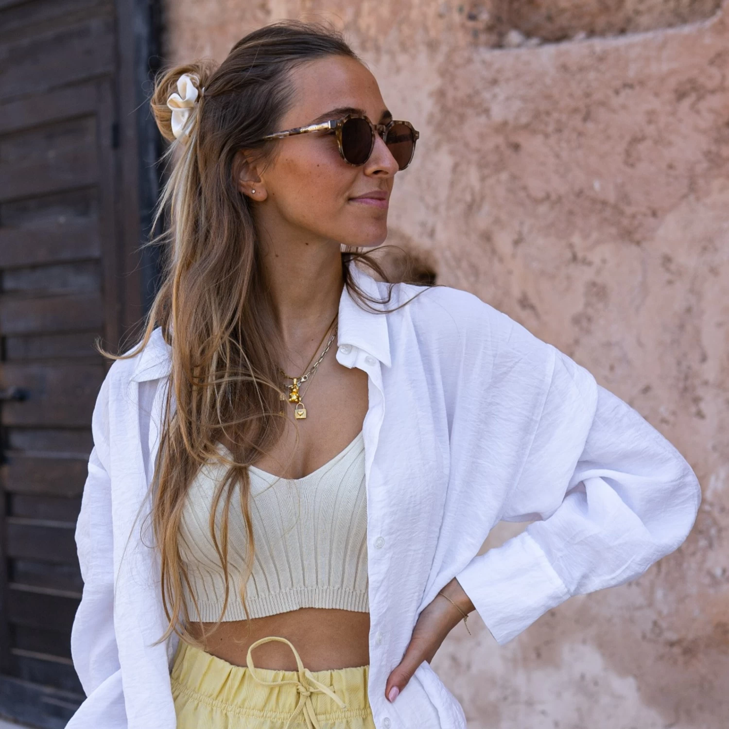 Hello Sunshine: mit unserer Sonnenbrille Manila Toffee Tortoise Brown kannst du die Sonnenstunden mit Style genießen! Dabei trifft klassische Eleganz auf moderne Finesse. Ihre besondere Formgebung macht dieses Brillenmodell mit einem wohlgeformten, wabenförmigen oberen Brillenrand zu einem absoluten It-Piece und Must-Have für alle Sonnenbrillen-LiebhaberInnen! Der Rahmen ist aus hochwertigem Bio-Acetat gefertigt und besticht durch seine interessante Farbwahl aus diversen, marmorierten Brauntönen. Gepaart mit den ebenfalls in dunklem Braun gehaltenen Premiumlinsen aus Nylon erhält die Manila ihren erstklassigen Look. Außerdem entsprechen diese dem höchsten Qualitätsstandard der EU-Kategorie 3 Norm und bieten deinen Augen einen optimalen UV400 Schutz. Design meets Quality: mit unserer Manila Toffee Tortoise Brown Sonnenbrille setzt du dich gekonnt in Szene!