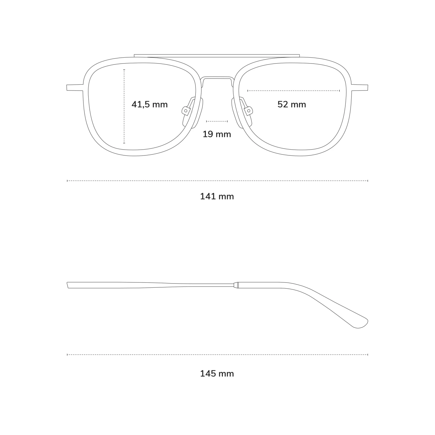 - Rahmenbreite: 141mm, Bügellänge: 145mm, Glasbreite: 52mm, Glashöhe: 41,5mm