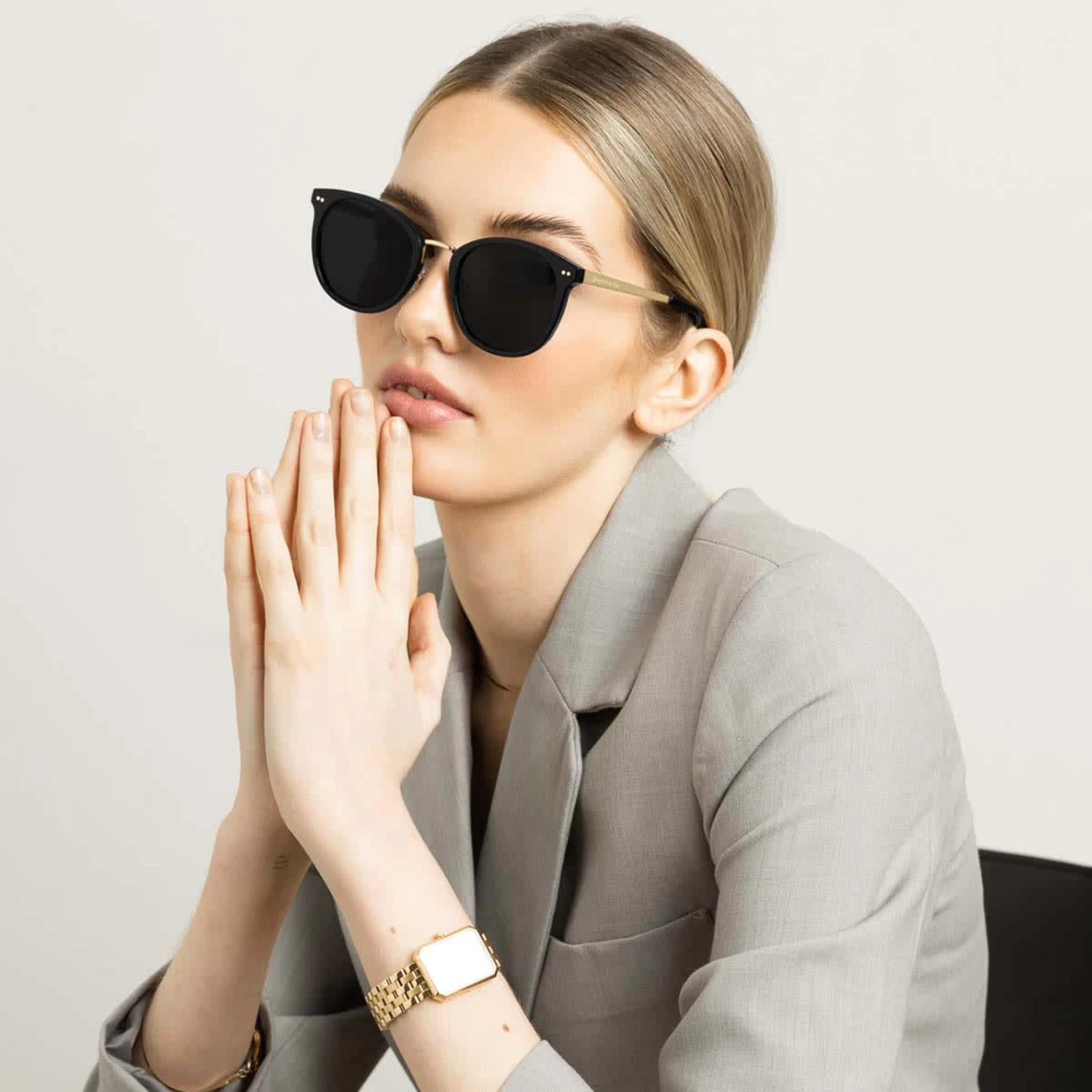 Du magst es extravagant und dennoch klassisch in Schwarz? Dann ĂĽberzeugt dich sicher das Sonnenbrillenmodell Prague All Black! Hier trifft besonderes Design auf herausragende Qualität! Der elegante, groĂźe Rahmen ist aus hochwertigem Bio-Acetat sowie extraleichtem Edelstahl gefertigt und besticht durch seine elegant schwarze Farbgebung mit goldenen Akzenten. Ebenfalls in Schwarz gehaltene und perfekt auf das Design abgestimmte Premiumlinsen aus Nylon komplettieren den modernen Look. Sie entsprechen dem höchsten Qualitätsstandard der EU-Kategorie 3 Norm und bieten deinen Augen einen zuverlässigen UV400 Schutz. Du suchst nach einem neuen Accessoire fĂĽr sonnige Tage? Dann ist unsere Prague All Black die perfekte Sonnenbrille fĂĽr dich – ein absolutes Must-Have, das bei keinem Outfit fehlen sollte!