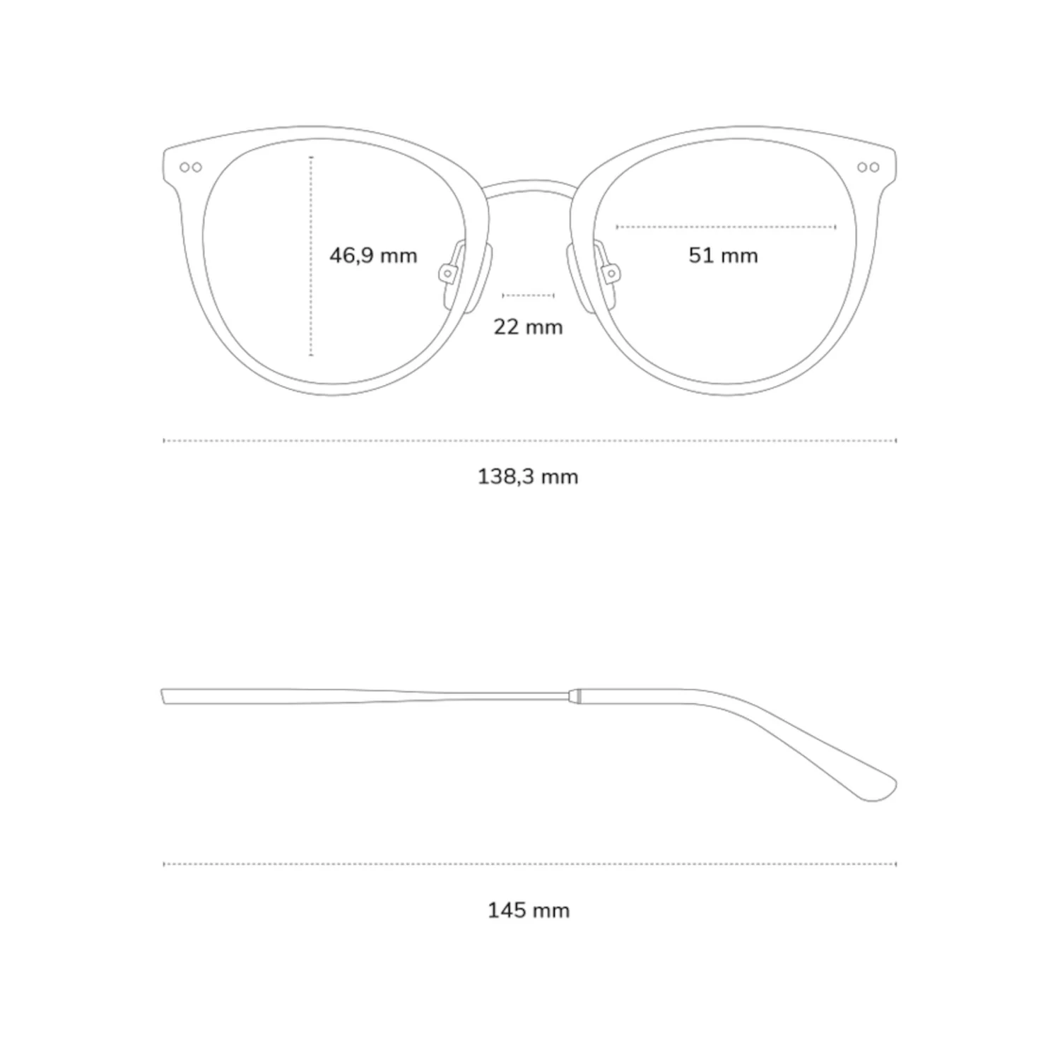 - Rahmenbreite: 138,3mm, Bügellänge: 145mm, Glasbreite: 51mm, Glashöhe: 46,9mm