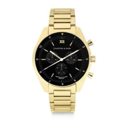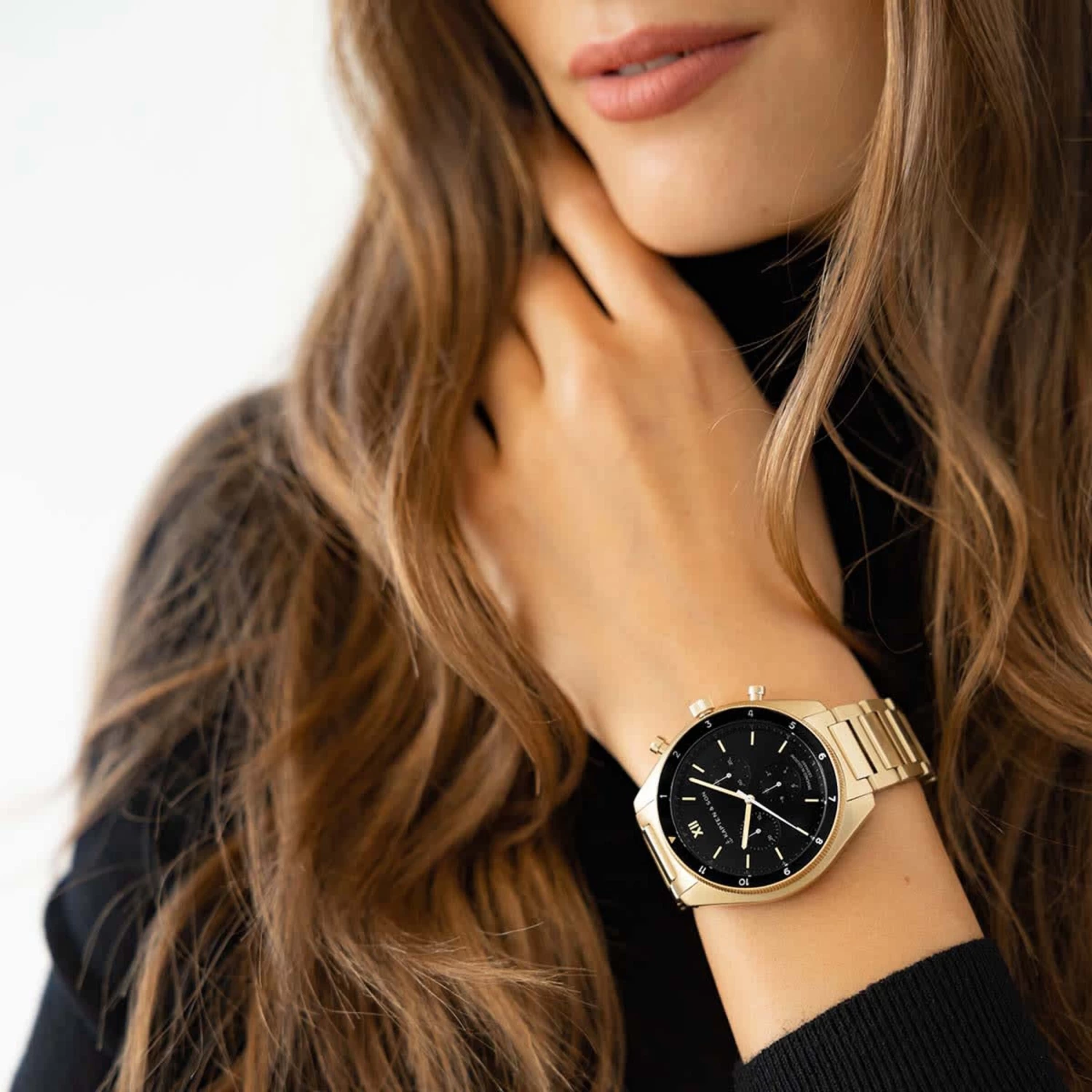 Unsere Rise Gold Black Steel – eine Armbanduhr der Extraklasse mit Next-Generation-Charisma! Dabei ĂĽberzeugt dieser Chronograph durch sein besonderes, markantes Design kombiniert mit verschiedenartiger Features. Gefertigt ist dieses Modell in edlem Gold aus hochwertigem, zu 100% recyceltem Edelstahl und umschlieĂźt ein Ziffernblatt in elegantem Schwarz. Das besonders robuste und kratzfeste Saphirglas schĂĽtzt deine Uhr zuverlässig und umhĂĽllt drei weitere kleine, separate Ziffernblätter, die dir eine Stoppfunktion und Intervallmessung der Zeit ermöglichen. Besonderes Highlight: mit Hilfe der perfekt ins Design integrierten 12h-LĂĽnette hast du die Möglichkeit eine zweite Zeitzone auf der Rise Uhr einzustellen, sodass dir zeitgleich die Uhrzeiten zwei verschiedener Orte auf der Welt angezeigt werden können – so kannst du beispielsweise sehen, wie spät es aktuell bei deinem Geschäftspartner in Los Angeles ist oder aber an deinem Lieblings-Urlaubsort in Mexico. Und auch in puncto Qualität ĂĽberzeugt die Rise Gold Black Steel: dank des erstklassigen Uhrwerks des Schweizer Herstellers Ronda ist diese Uhr besonders langlebig und funktioniert nicht nur als stylisches Fashion-Accessoire, sondern vor allem als zuverlässiger Begleiter, an dem du lange Zeit Freude haben kannst. Du suchst eine Uhr mit Premium-Charakter? Dann ist unsere Rise Gold Black Steel die perfekte Uhr fĂĽr dich!