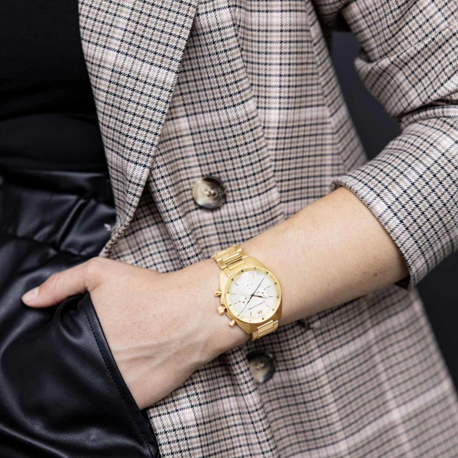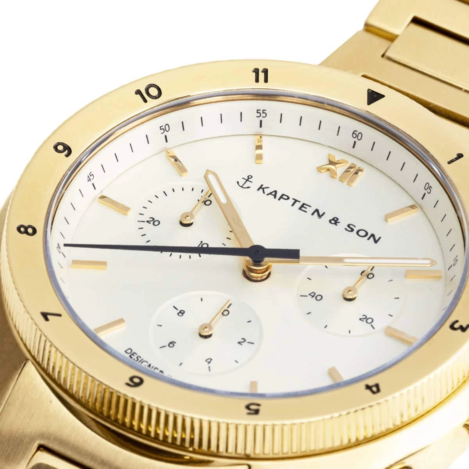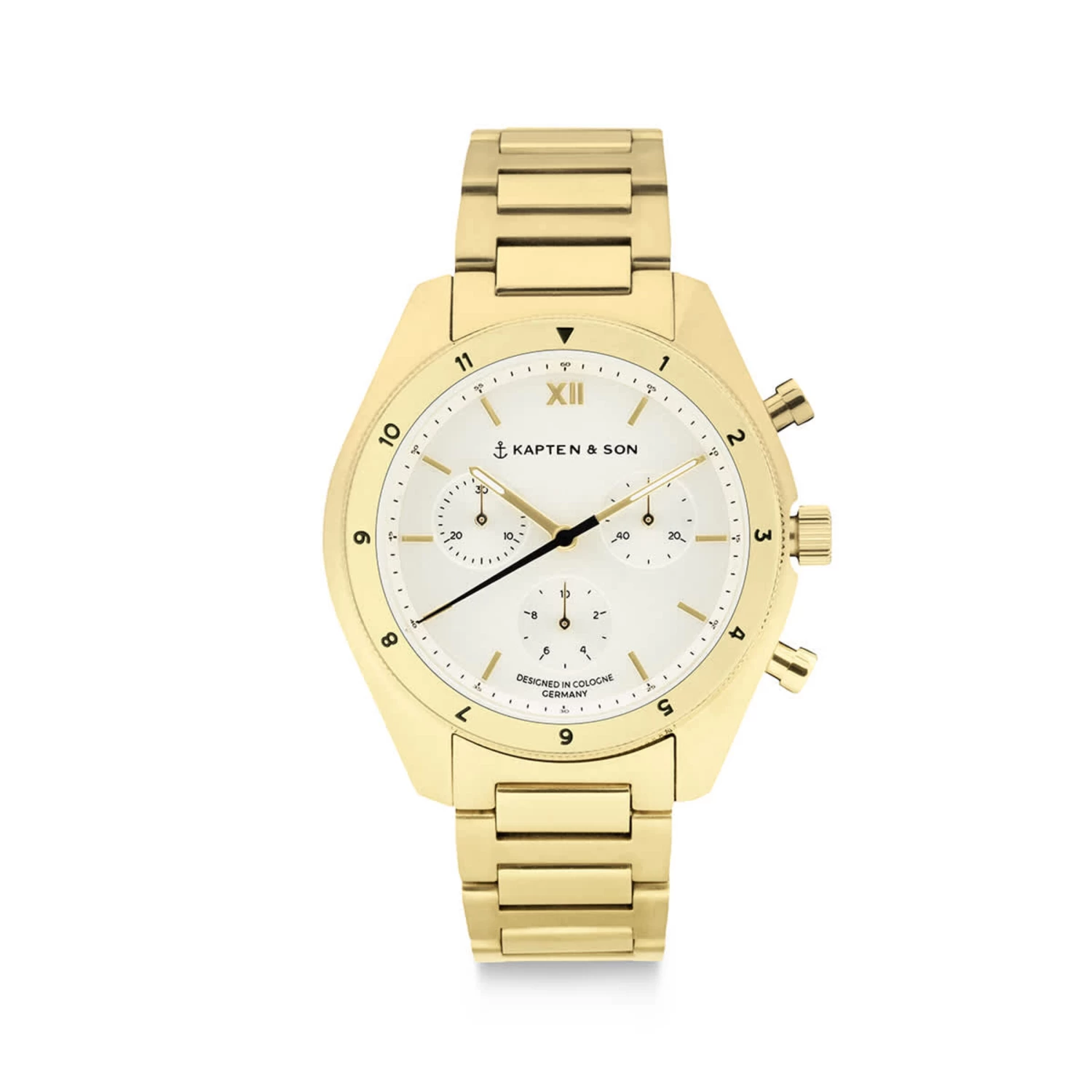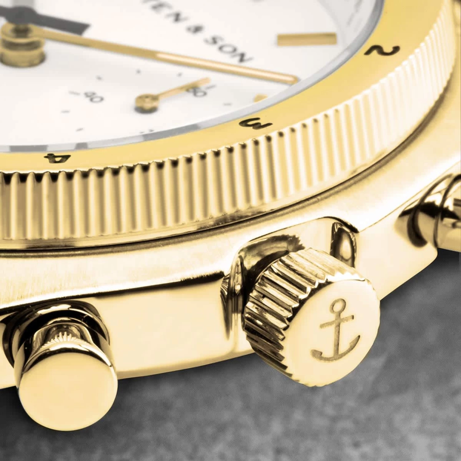 Stylische Uhr im Next Generation-Design: unsere Rise Small Gold Steel aus 100% recyceltem Edelstahl! Dabei überzeugt dieser extravagante Chronograph neben seiner erstklassigen Materialwahl gleichermaßen durch sein formschönes Design und die verschiedenartigen Features. Das elegant markante Gehäuse glänzt in luxuriösem Gold und umfasst ein schlichtes, in weiß gehaltenes Ziffernblatt, das durch robustes und besonders kratzfestes Saphirglas optimal geschützt wird. Drei weitere kleine Ziffernblätter dienen der Intervallmessung und Stoppfunktion. Das wohl speziellste Feature dieses Uhrenmodells ist die 12h-Lünette, die perfekt in das Design dieses Chronographen integriert wurde und es dir ermöglicht, bequem eine zweite Zeitzone auf deiner Uhr einzustellen – so hast du parallel beispielsweise neben deiner Uhrzeit vor Ort auch die deiner Familie in Südamerika im Blick. Damit du lange Zeit Freude an deinem neuen Lieblings-Accessoire haben kannst, haben wir ein Uhrwerk des Schweizer Herstellers Ronda in die Rise eingebaut, das für seine besondere Langlebigkeit bekannt ist. Du bist auf der Suche nach einem echten Multi-Talent unter den Uhrenmodellen? Dann sollte deine Wahl auf unsere Rise Small Gold Steel fallen – die perfekte Uhr für jeden Anlass!