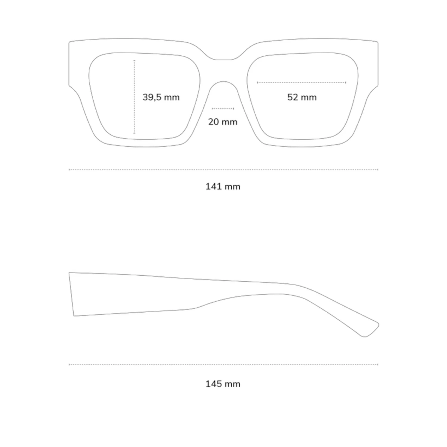 - Rahmenbreite: 141mm, Bügellänge: 145mm, Glasbreite: 52mm, Glashöhe: 39,5mm