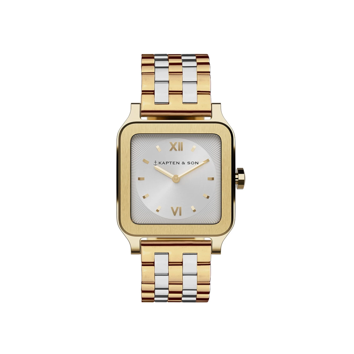 Zeit für die Tresor Gold Bicolor Steel! Diese Premium-Uhr überzeugt durch ihre außergewöhnliche und dennoch klassische Kombination aus Gold und Silber. Das grobgliedrige Armband besteht aus hochwertigem 316L Edelstahl und lässt sich dank des praktischen Butterfly-Verschlusses ganz easy an- und ablegen. Durch den zart gerillten Sonnenstrahlenschliff wirkt das markante Zifferblatt mit 3D-Effekt noch extravaganter. Aber die Tresor Gold Bicolor Steel punktet nicht nur durch ihr Design. Das Herzstück dieses Schmuckstücks bildet ein Uhrwerk des Schweizer Herstellers Ronda, das besondere Langlebigkeit verspricht. Diese Uhr wird an jedem Handgelenk zu einem zeitlosen Hingucker!