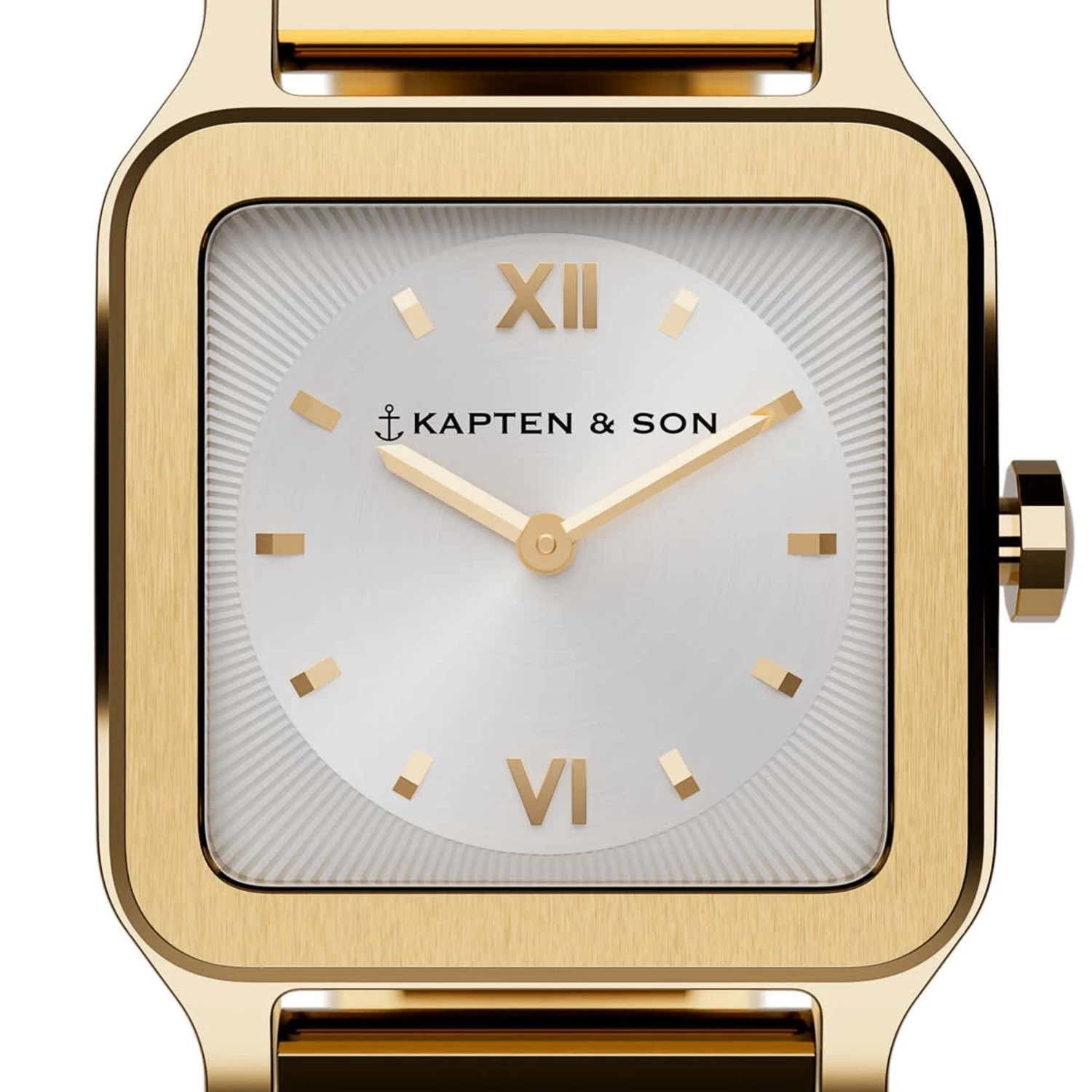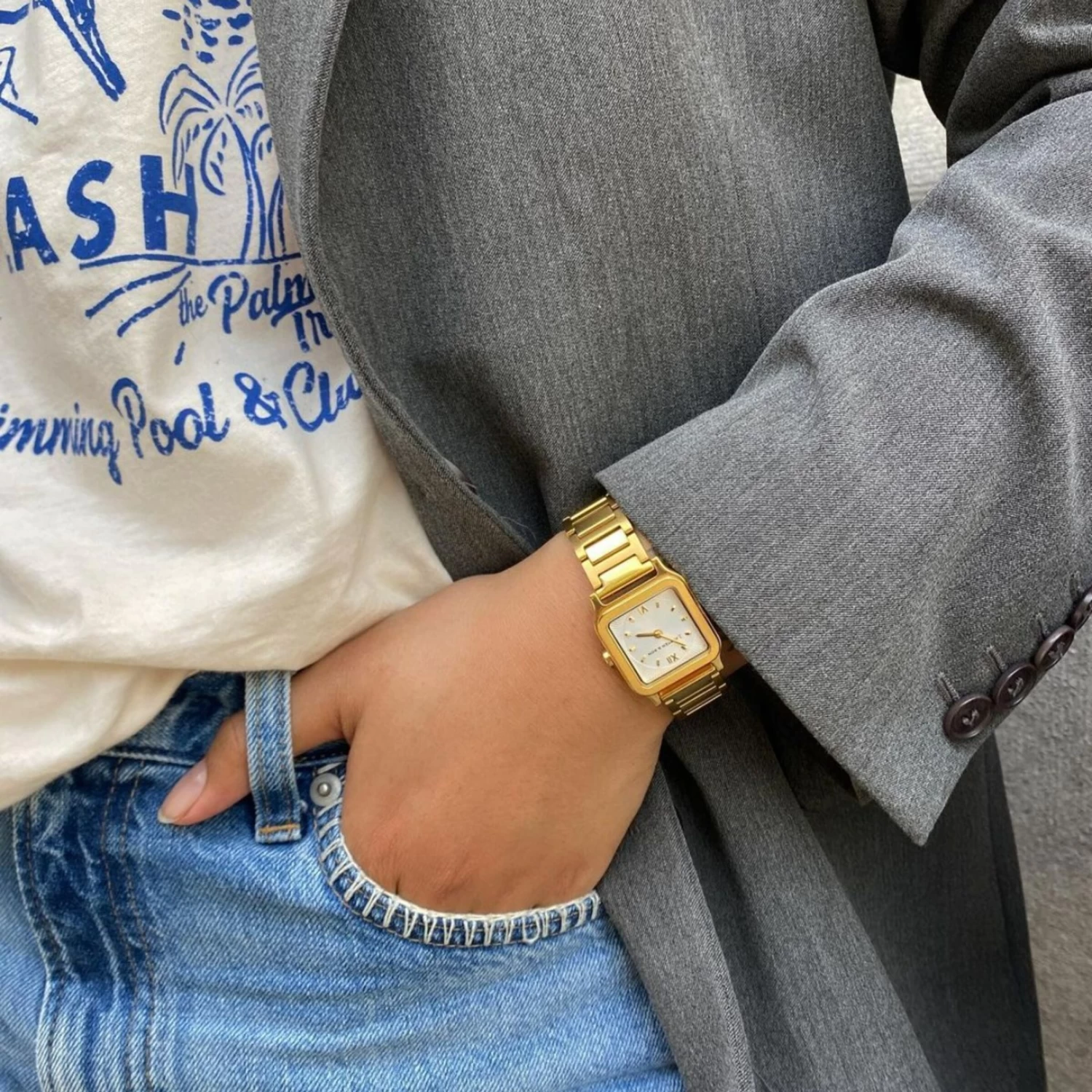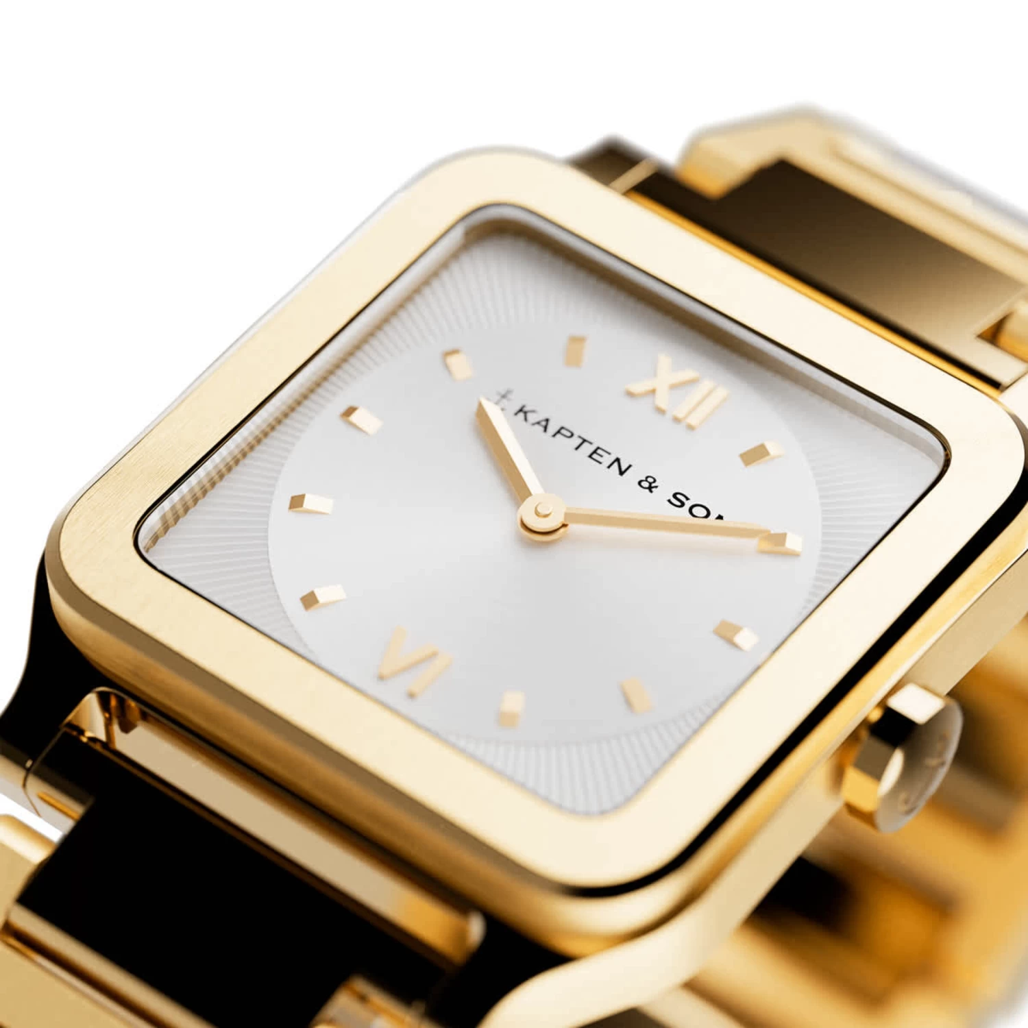 Unsere Tresor Gold Bold Steel Uhr – ein Premiummodell unter den Armbanduhren, das sowohl mit seinem erstklassigen Design als auch hochwertigster Qualität ĂĽberzeugt! Dabei besticht diese hochwertige goldene Uhr aus recyceltem 316L Edelstahl durch ihr markant eckiges, quadratisches Gehäuse, welches ein besonders elegantes, weiĂźes Ziffernblatt mit zart gerilltem Sonnenstrahlenschliff bettet. Das grobgliedrige Steel-Armband perfektioniert den exquisiten Look der Tresor und macht sie zu einem absoluten Eye-Catcher! Ein extra langlebiges Uhrwerk des Schweizer Herstellers Ronda bildet das HerzstĂĽck dieses SchmuckstĂĽckes und macht sie zu einem treuen Begleiter, egal zu welchem Anlass. Du suchst nach einem neuen Uhren-Highlight? Dann ist unsere Tresor Gold Bold Steel das perfekte Accessoire fĂĽr dich!