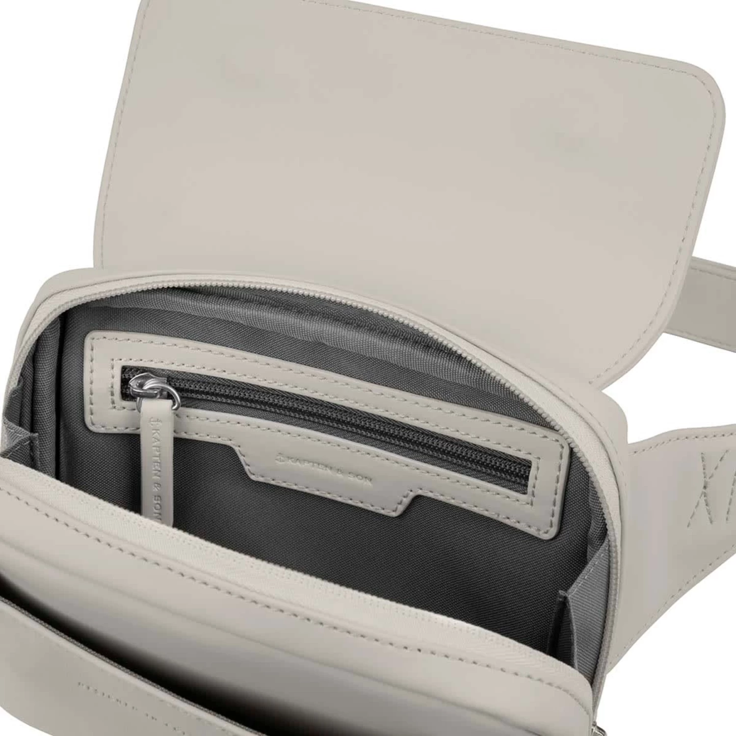 Drei Innenfächer, eins davon schließt mit Reißverschluss, ein flaches Außenfach auf der Vorderseite und ein Außenfach auf der Rückseite