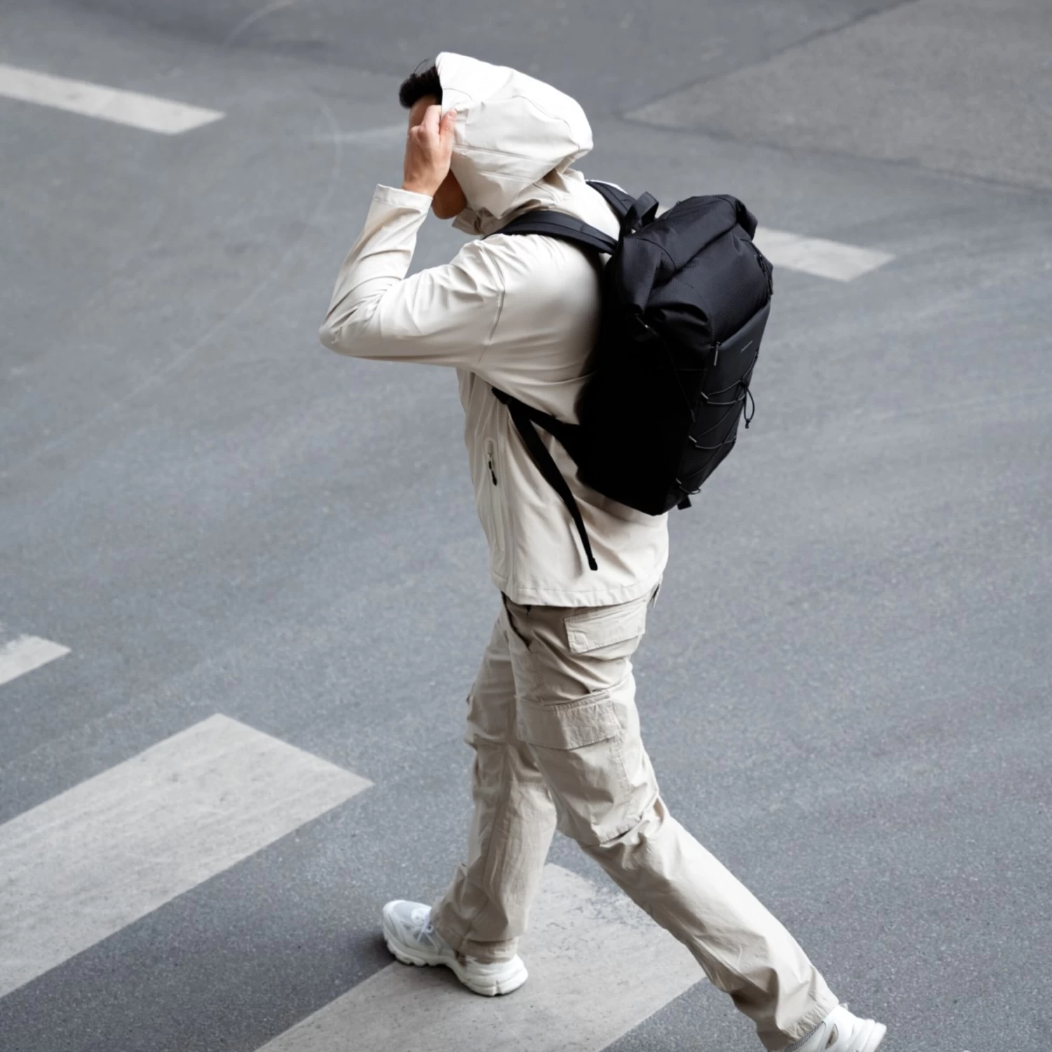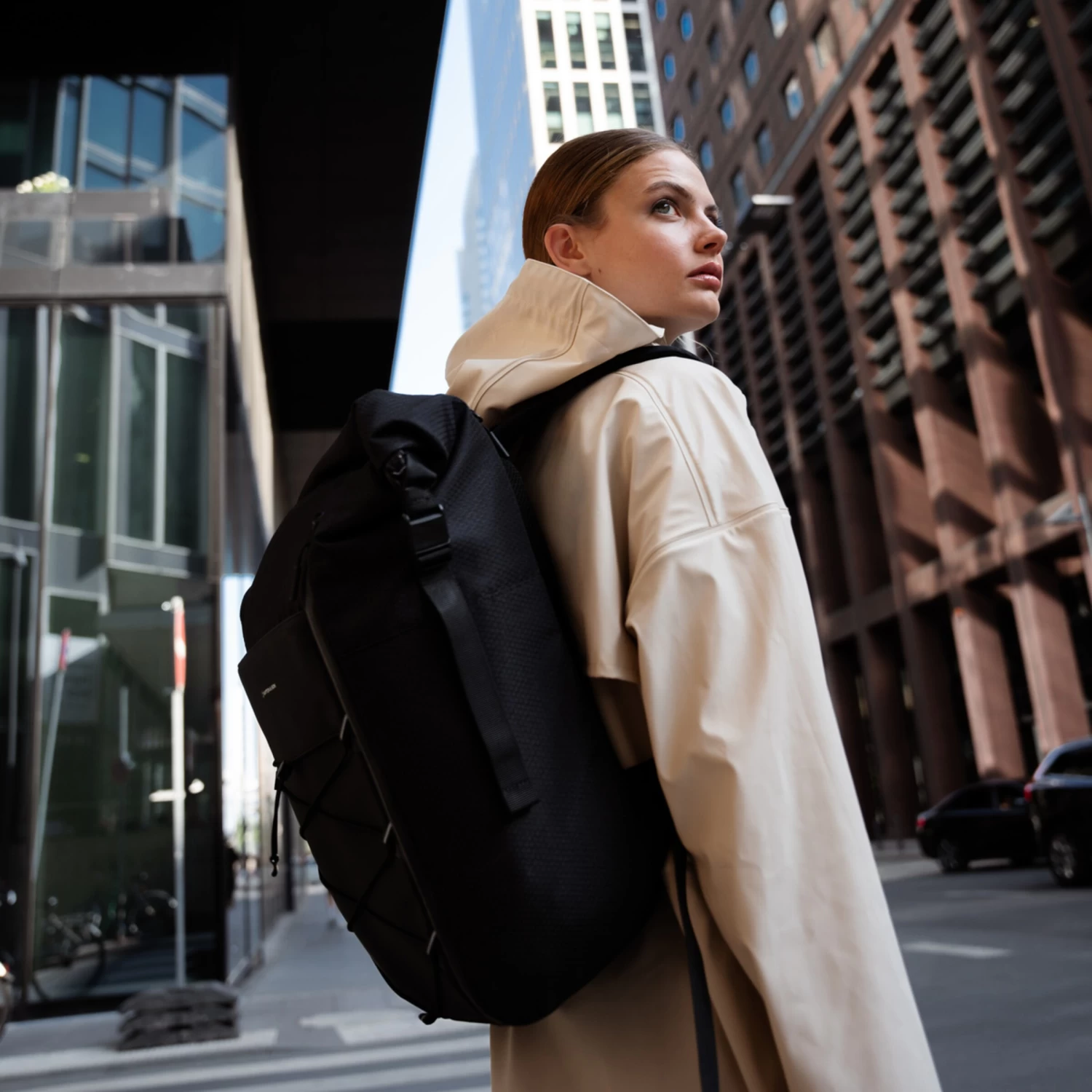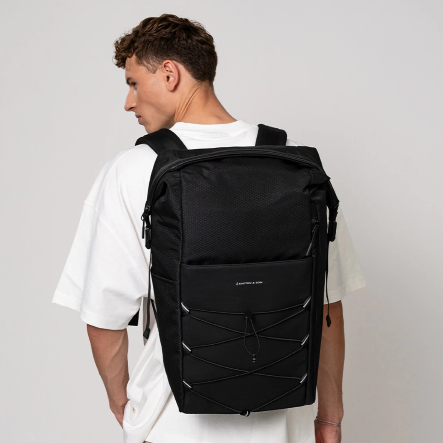- extra wasserabweisender Mix aus Ripstop, recyceltem PET und veganem Tech-Material