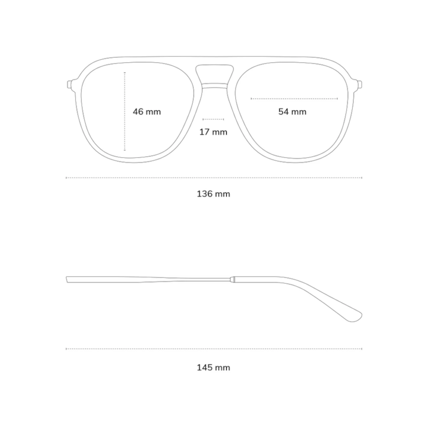 - Rahmenbreite: 136mm, Bügellänge: 145mm, Glasbreite: 54mm, Glashöhe: 46mm